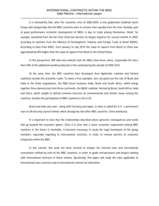 This document discusses international contracts within the BRIC countries (Brazil, Russia, India, China). It examines two major conventions: [1] The Vienna Convention on Contracts for the International Sale of Goods, which establishes uniform rules for international sale of goods contracts and has been ratified by 74 countries. [2] International conventions on arbitration, including the UNCITRAL Model Law on Arbitration Procedures, which aims to harmonize national arbitration laws. The document analyzes how each BRIC country approaches these conventions to guide those dealing with international contracts within the BRIC nations.