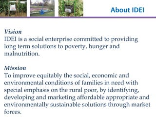IDEI is a social enterprise focused on alleviating poverty and malnutrition among rural families by providing sustainable agricultural solutions, particularly through technologies like treadle pumps and low-cost drip irrigation systems. The organization has impacted over 1.2 million smallholder farm families in India, enhancing their productivity while significantly reducing carbon emissions and water usage. IDEI also works on integrating farmers into market systems and plans to introduce future technologies like solar-powered pumps and low-cost greenhouses.