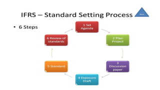 International Financial Reporting Standards (IFRS) are issued by the International Accounting Standards Board to establish consistent, transparent, and comparable financial reporting around the world. IFRS address record keeping, financial reporting, and other aspects of financial reporting. While not universal, with the US using GAAP, IFRS are used in the European Union, India, Hong Kong, Australia, and other countries. The objectives of IFRS include bringing uniformity to accounting practices, expanding global capital markets, enhancing transparency, and reducing reporting costs. Financial statements prepared under IFRS include a statement of financial position, statement of comprehensive income, statement of changes in equity, and cash flow statement.