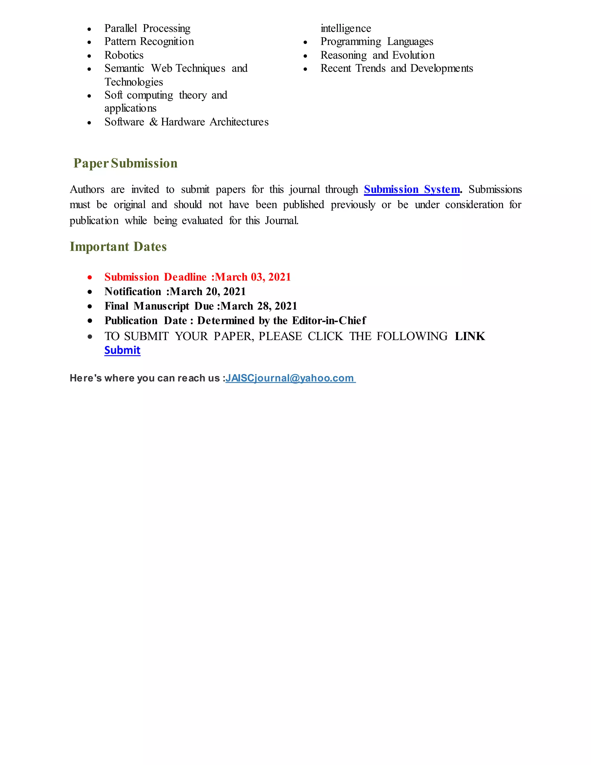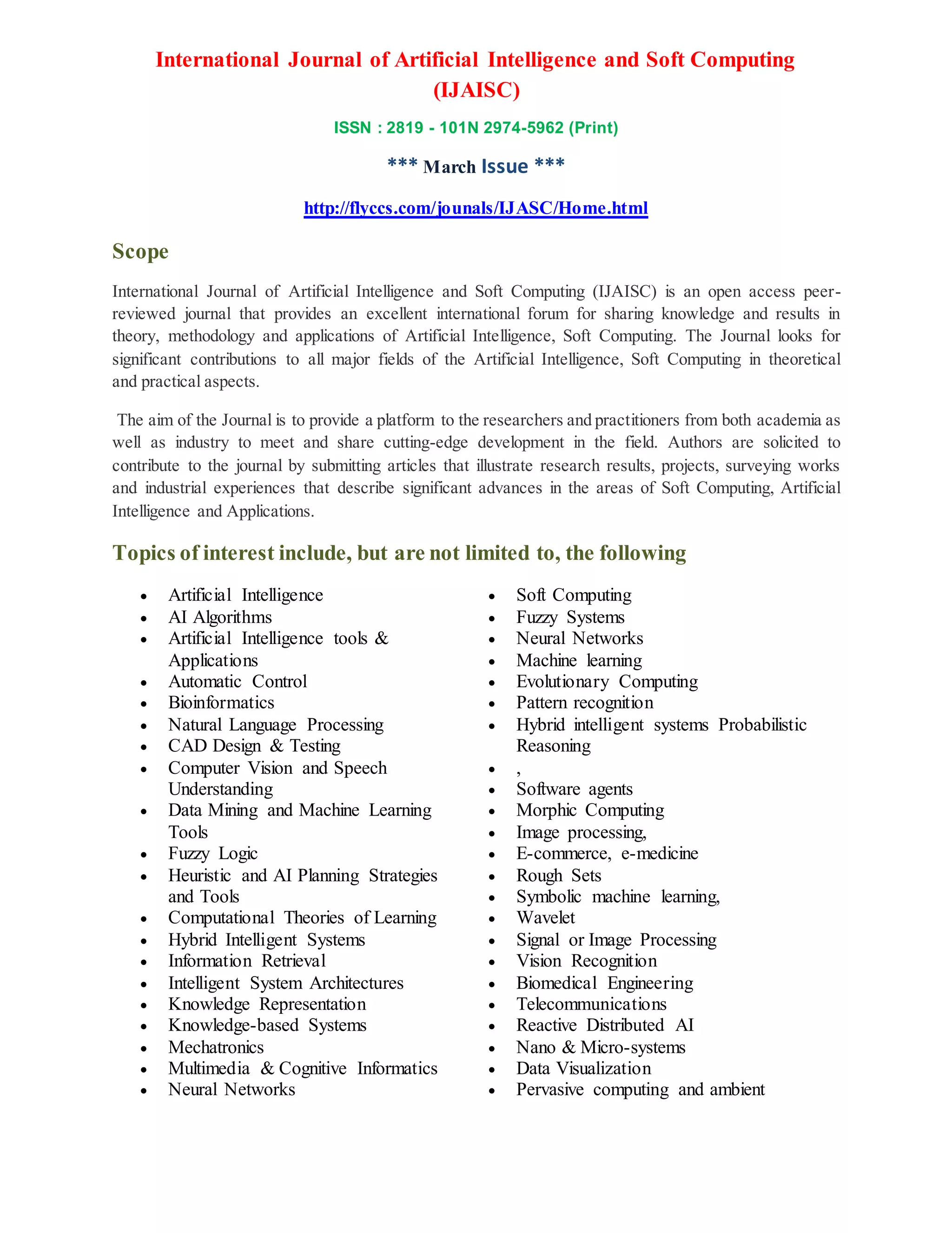 The document summarizes the International Journal of Artificial Intelligence and Soft Computing (IJAISC). It provides an overview of the journal's scope, which is to provide an international forum for sharing knowledge and research results in artificial intelligence and soft computing. The journal accepts theoretical and applied contributions across many topics, including artificial intelligence algorithms and tools, data mining, fuzzy logic, neural networks, and more. It invites researchers and industry professionals to submit original research papers and invites submissions by the listed important dates.