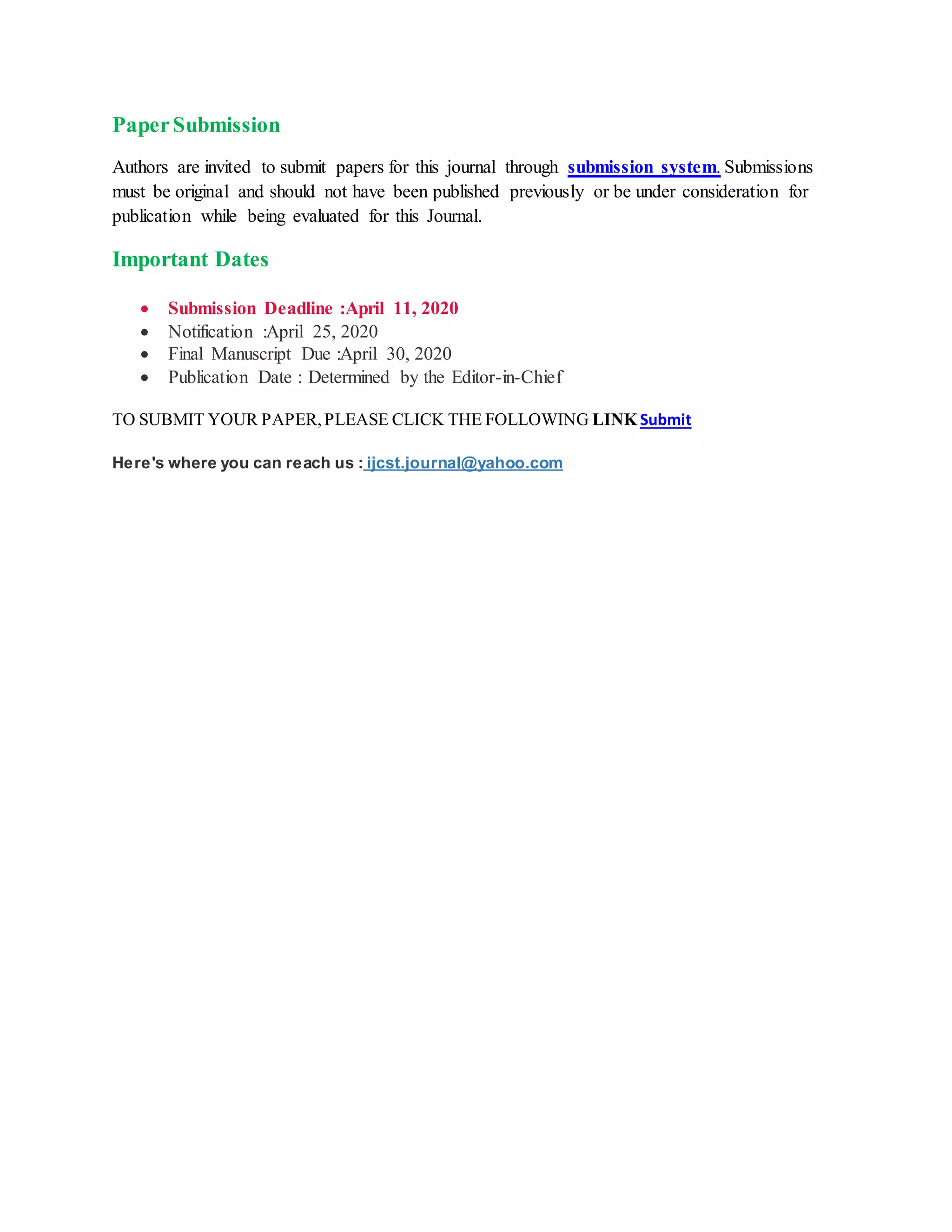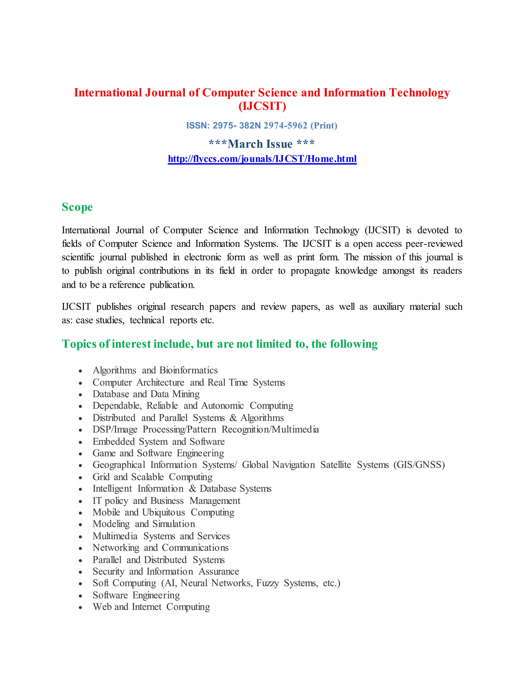The International Journal of Computer Science and Information Technology (IJCSIT) is an open access, peer-reviewed journal dedicated to publishing original research and review papers in various fields of computer science and information systems. Topics of interest include algorithms, data mining, software engineering, and security, among others. Authors can submit papers through a submission system by the specified deadlines for publication consideration.