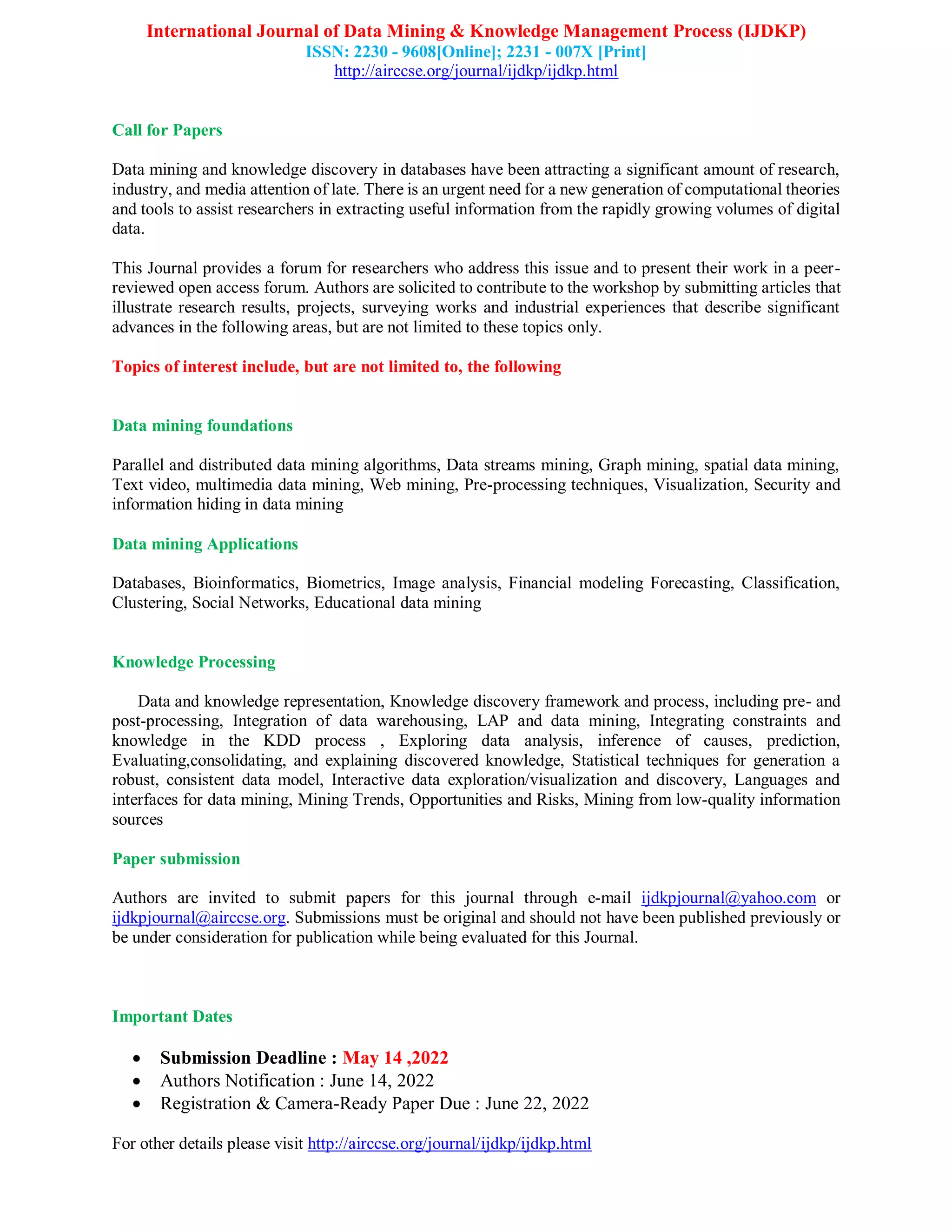 The International Journal of Data Mining & Knowledge Management Process invites submissions for research on data mining and knowledge discovery. Topics of interest include foundational theories, various mining applications, and knowledge processing techniques. Authors must submit original papers by May 14, 2022, with notifications sent by June 14, 2022.