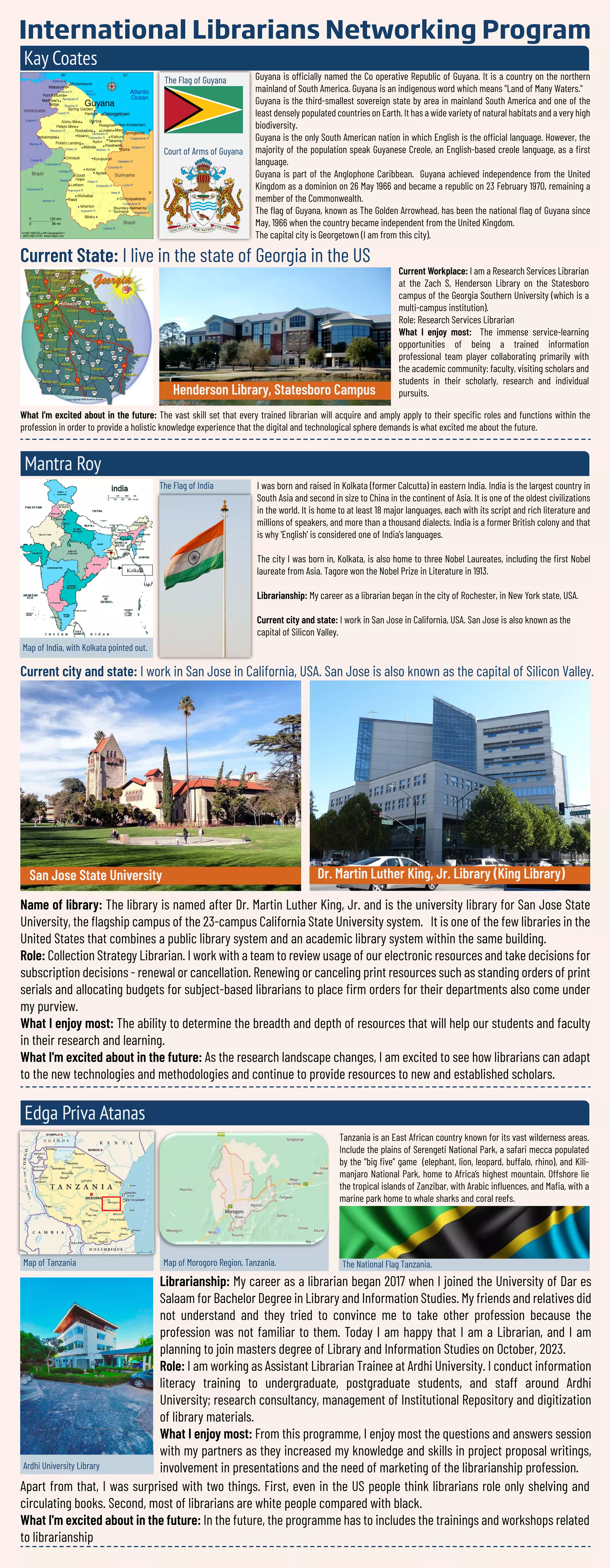 The document provides biographical information about several librarians. It discusses where they were born and raised, their current cities and states of employment, and their roles and responsibilities as librarians. It also includes brief descriptions of Guyana, India, Tanzania, and the libraries or institutions where some of the librarians work.