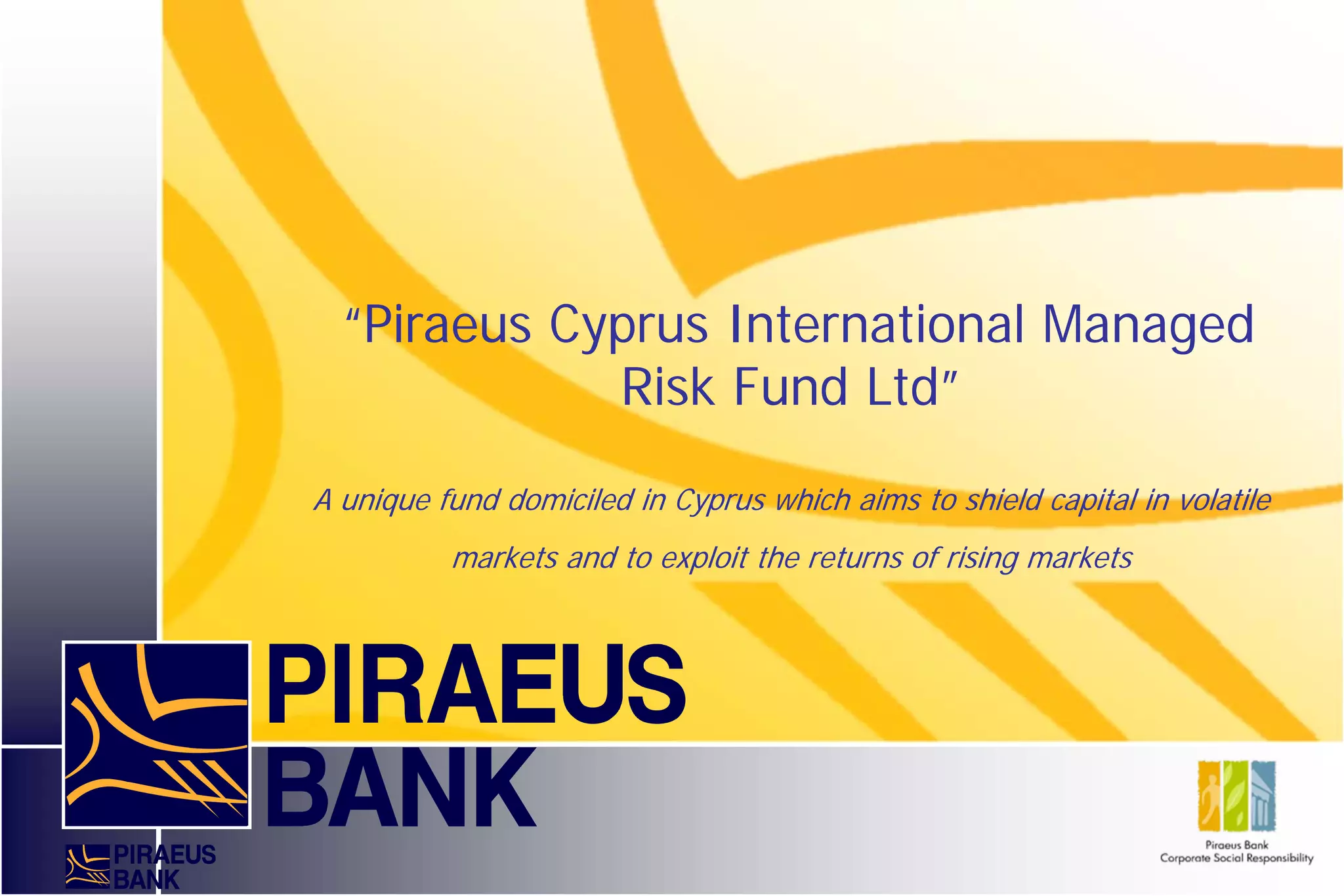 The document describes the "Piraeus Cyprus International Managed Risk Fund Ltd", a fund domiciled in Cyprus that aims to protect capital in volatile markets while exploiting returns in rising markets. It is managed by the Fund Management Department of Piraeus Bank Cyprus, which has experience managing third party mandates. The management team has extensive experience in investments and risk management. The fund uses dynamic rebalancing strategies to optimize returns within preset risk boundaries in changing market conditions.
