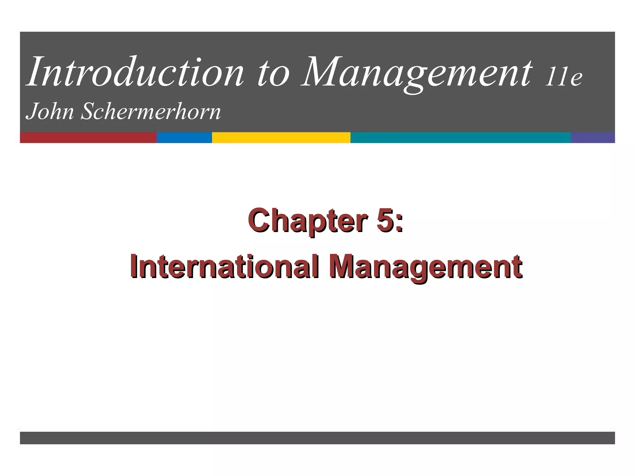 This document summarizes key points from Chapter 5 of the textbook "Introduction to Management 11e" by John Schermerhorn. It discusses the challenges of globalization for businesses, including differing legal systems, political risks, and trade agreements across countries. It defines global businesses as multinational corporations that operate in multiple countries, and outlines some of the mutual benefits and complaints that can arise between global businesses and their host countries. It also discusses how culture, such as concepts of time, space, and values, impacts global management practices. Finally, it summarizes research from the GLOBE project on leadership dimensions and cultural practices around the world.