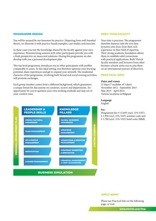 The International Management Programme is a 21-day training program held over 7 modules within a 9 month period. It is designed for managers with at least 8 years of professional experience including 4 years of management experience who work in an international context. The program aims to strengthen leadership skills and provide a more generalist view of management beyond one's own function. Participants gain tools and concepts for dealing with the challenges of globalization through relevant case studies and interactions with a diverse group of peers from different industries and countries.