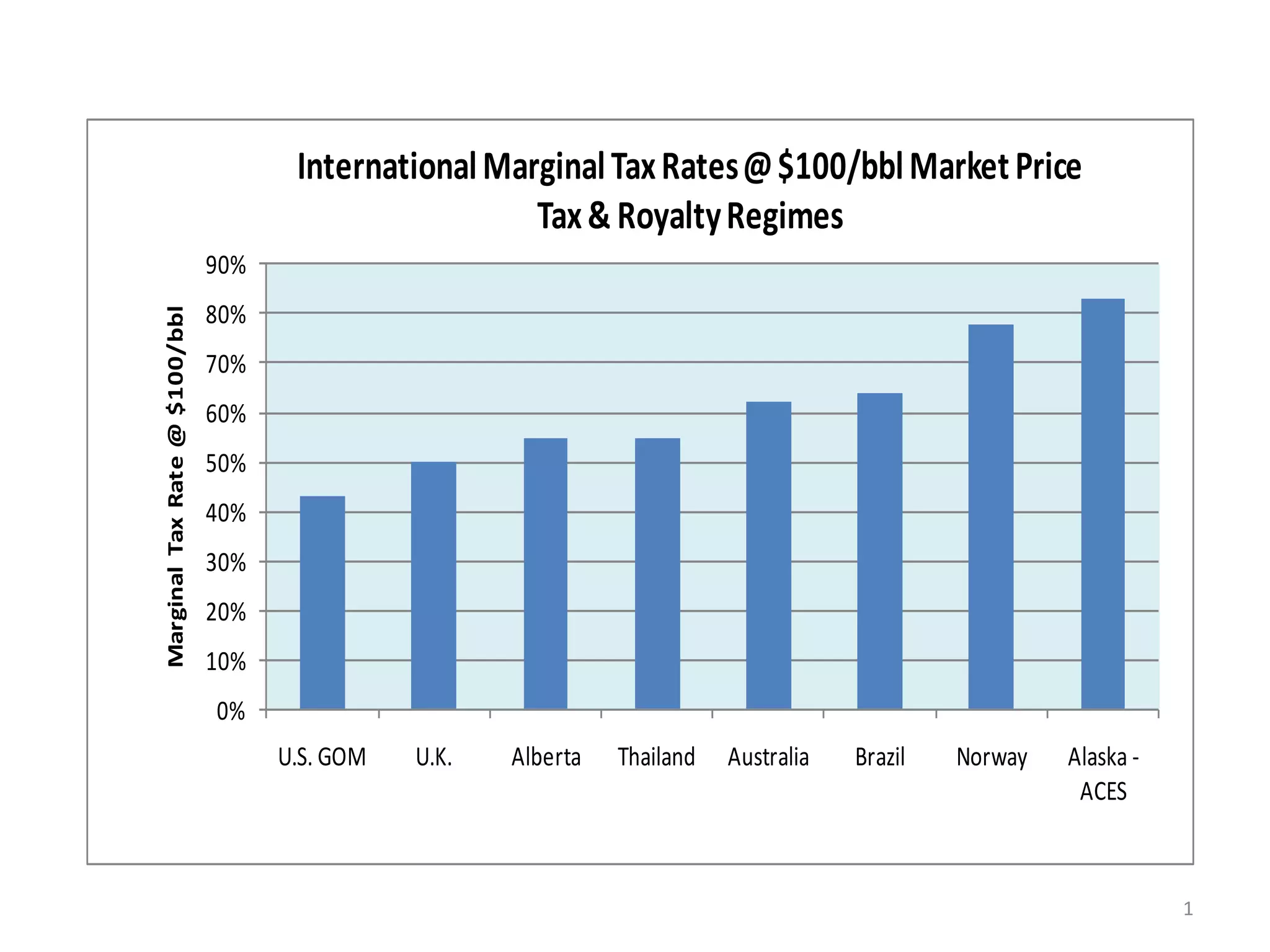 The document contains information about international marginal tax rates for oil production at a $100/barrel market price. It shows that the marginal tax rate in Alaska under the Alaska's Clear and Equitable Share (ACES) tax system is one of the lowest among major oil producing jurisdictions ranging from 0% to 80%.