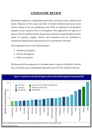 This document discusses international migration trends and provides definitions and frameworks from various international organizations. It begins by defining key terms like migrant, migrant worker, and related rights as outlined by the United Nations and International Labour Organization. It then summarizes the UN Convention on the Protection of Rights of All Migrant Workers and Members of Their Families, including its scope and establishment of minimum standards. Finally, it discusses rationales for migration like pull factors drawing migrants to new countries and push factors compelling migration from home countries, as well as effects on both sending and receiving countries.