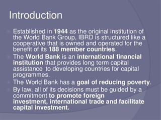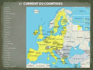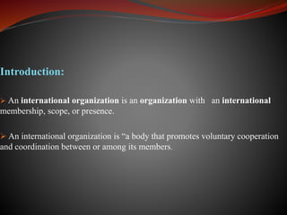 This document discusses types of international organizations and provides examples of each. It outlines two main types: 1) International Non-Governmental Organizations like the Red Cross which operate independently of governments, and 2) International Governmental Organizations like the UN and EU which are composed of sovereign states working cooperatively. The document then provides more details on the European Union, outlining its history, structure, aims and current issues.