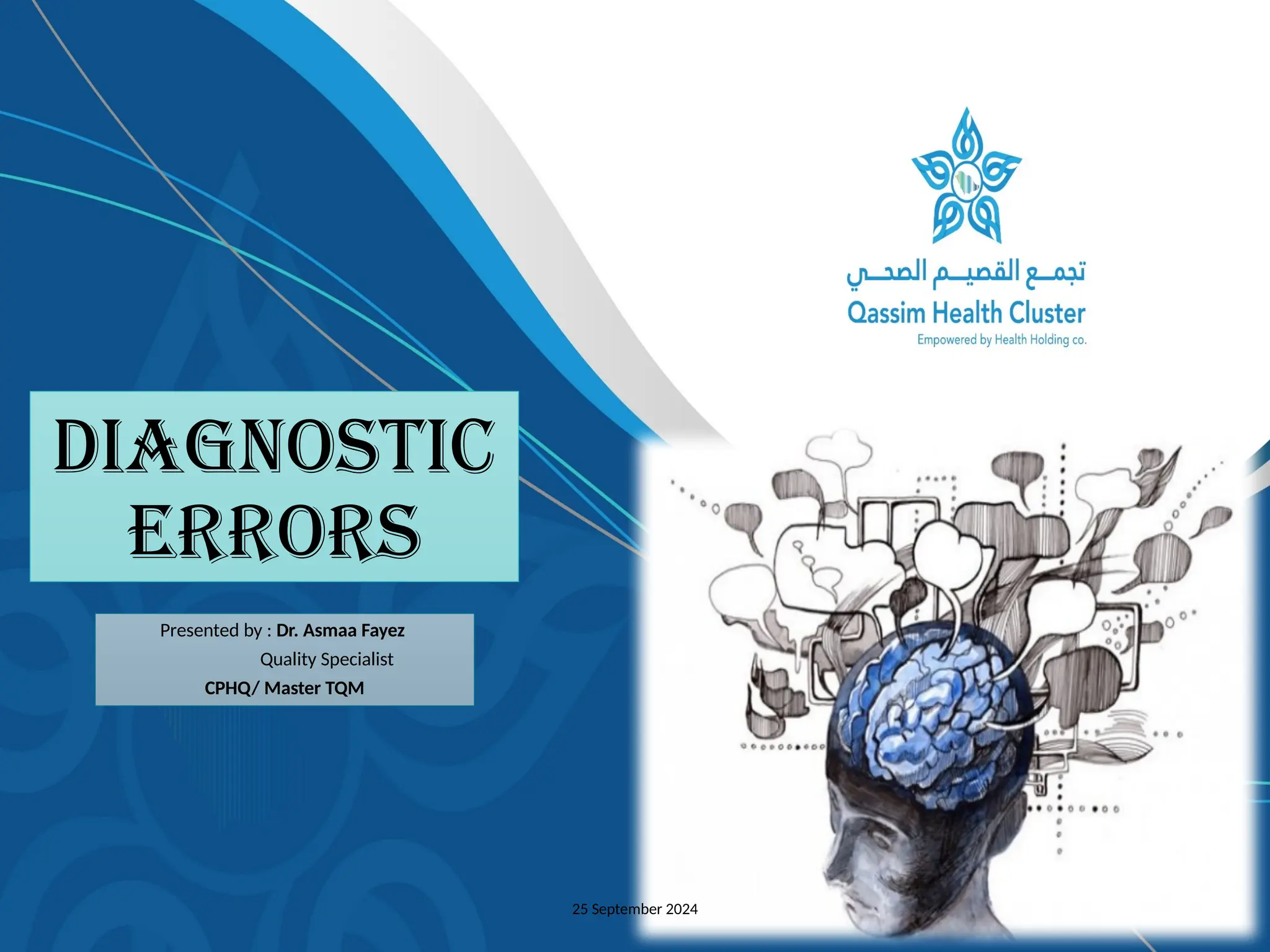 The document discusses diagnostic errors, particularly focusing on cognitive biases and their impact on decision-making in healthcare. Dr. Asmaa Fayez emphasizes the importance of recognizing and mitigating these biases to avoid human errors that can lead to serious incidents. The presentation highlights the urgent need for timely interventions in the context of patient safety.