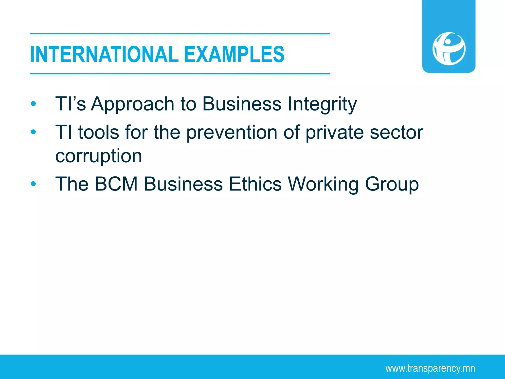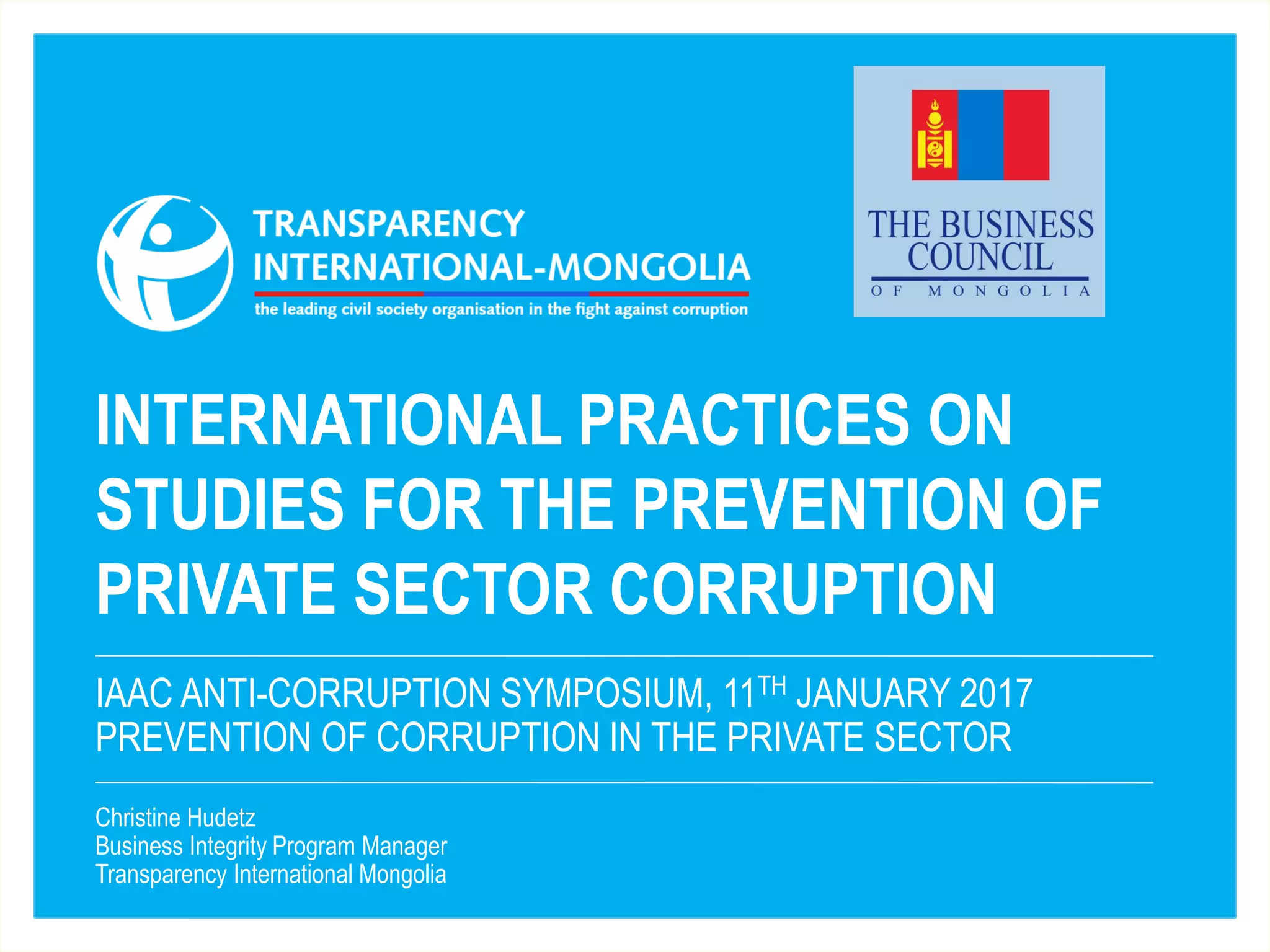 Christine Hudetz from Transparency International Mongolia discussed Transparency International's approach to preventing private sector corruption. TI works at the environmental, industry, and individual business levels to strengthen integrity. TI has developed tools like the Business Principles for Countering Bribery and the Business Integrity Country Agenda to assess challenges and engage stakeholders. In Mongolia, the BCM Business Ethics Working Group was formed in 2016 to advance integrity among its members through activities, statements, and tools.