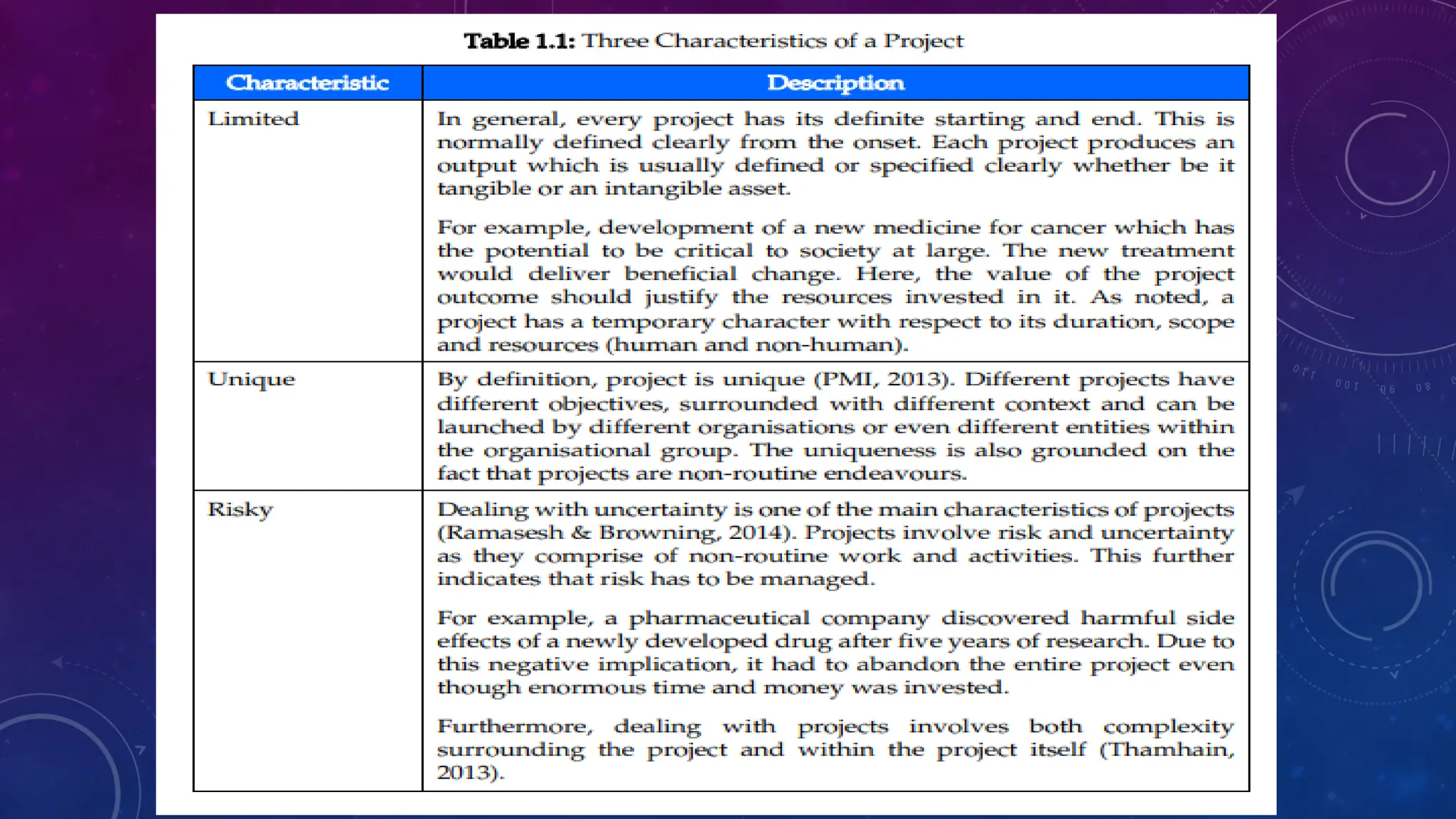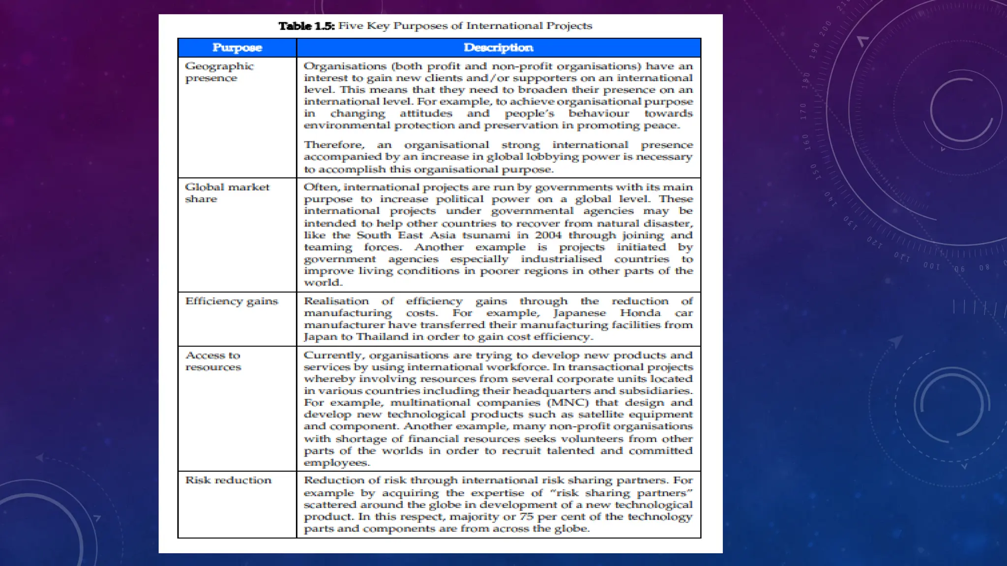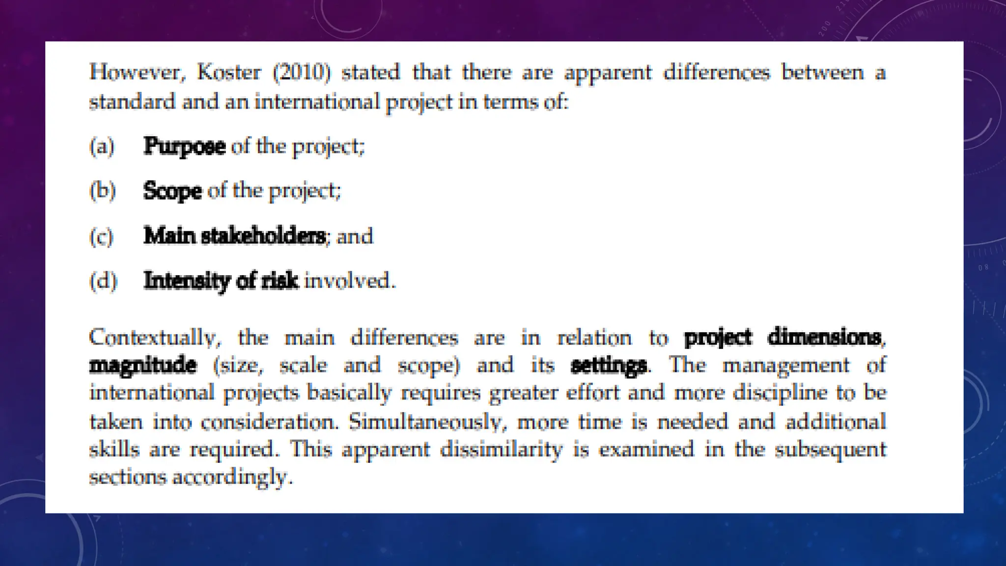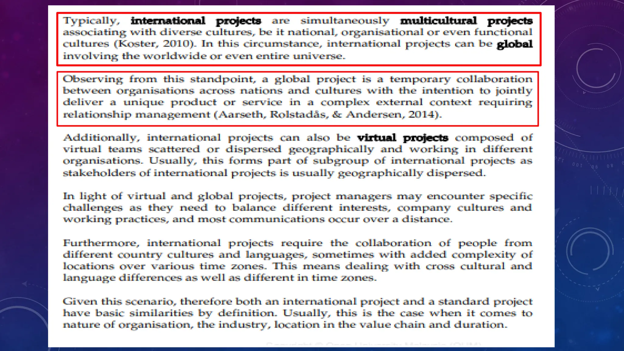 This document outlines a module on international project management. It includes a module outline listing topics and study hours. The module learning outcomes are described as being able to describe core concepts of international projects, discuss project lifecycle phases and risks/uncertainties, and explain human aspects of managing international projects. The topics covered are: core concepts and theory of projects; context of international projects; defining, planning, organizing, leading, communicating, and cooperating on international projects; and implementation/control. An introduction to the first topic defines key project management concepts and contrasts international vs standard projects.