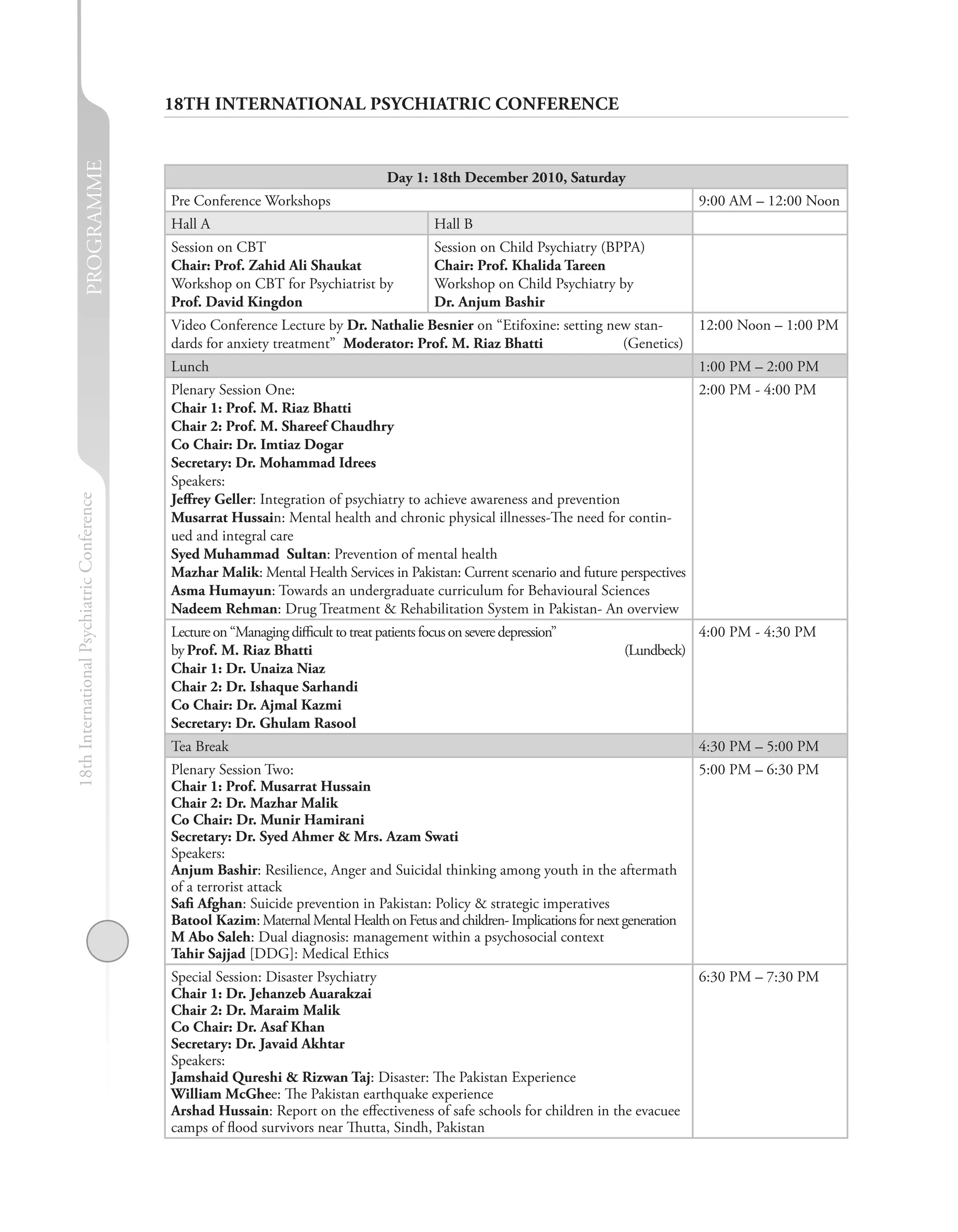 This document provides the programme details for the 18th International Psychiatric Conference taking place over 2 days from December 18-19, 2010. Day 1 includes pre-conference workshops, plenary sessions on various topics such as CBT, child psychiatry, mental health services in Pakistan, and a special session on disaster psychiatry. The day concludes with the inauguration ceremony. Day 2 consists of more plenary sessions, a Quaid-e-Azam memorial lecture, parallel paper presentation sessions, and workshops on CBT and dementia. The conference brings together national and international experts to discuss important issues in psychiatry.
