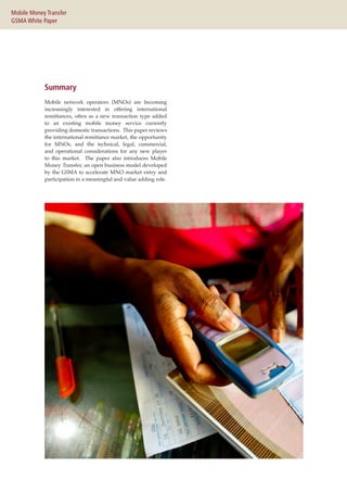 This document discusses considerations for mobile network operators seeking to offer international remittance services. It covers the market opportunity for international remittances, the key stakeholders that would be involved including customers, MNOs, money transfer operators, and regulators. It then discusses important technical, legal, commercial and operational considerations for MNOs including regulatory compliance, foreign exchange, service design choices around partnerships with money transfer operators, and enhanced customer due diligence. The document aims to provide guidance to help MNOs successfully participate in the international remittance business.