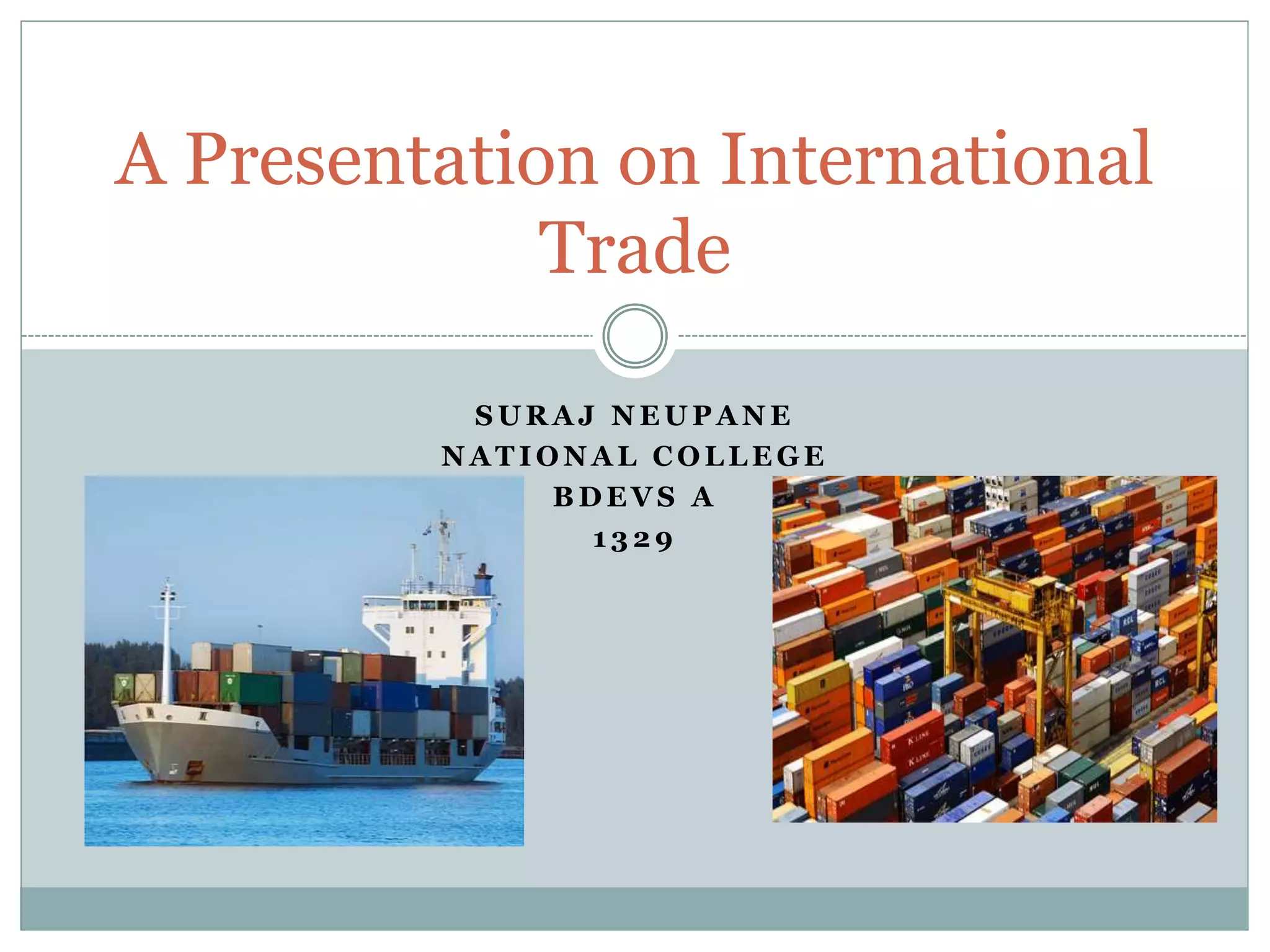 The document discusses international trade and Nepal's trade patterns. It notes that in 2008, over 30% of global output was traded internationally, exceeding $16 trillion. International trade promotes economic growth and development by allowing countries to specialize according to comparative advantage. Nepal has a large trade deficit, with imports doubling between 2063/64 and 2067/68 while exports only increased modestly. The majority of Nepal's trade is with India, and Nepal relies heavily on imports for consumption goods while mainly exporting agricultural products.