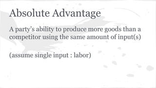 The document discusses the concepts of absolute and comparative advantage in international trade. It explains that absolute advantage refers to a party's ability to produce more of a good using the same input, while comparative advantage relates to producing goods at a lower opportunity cost. The document illustrates these principles with examples and emphasizes the benefits of specialization in production.
