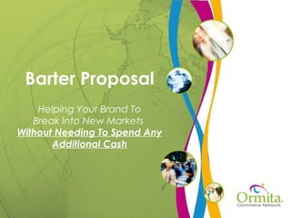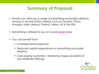 The document proposes a barter program where companies can get advertising and PR services without spending cash. Through Ormita, companies can get exposure across various markets by providing their own products/services in exchange. Ormita will find media partners in other regions to accept the bartered goods/services, thereby gaining new customers outside existing markets. The proposal describes various advertising options available through barter and provides examples of companies that have participated successfully.