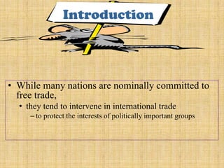 This document summarizes the political economy of international trade. It discusses how governments often intervene in trade to protect domestic groups, using instruments like tariffs, subsidies, import quotas, and voluntary export restraints. Tariffs raise the costs of imports but also domestic prices. Subsidies help domestic producers but are costly for consumers and taxpayers. The document analyzes examples of trade interventions and their effects, such as the EU ban on hormone-treated beef and US steel tariffs. It also discusses the emergence of institutions like the GATT and WTO that aim to liberalize trade.
