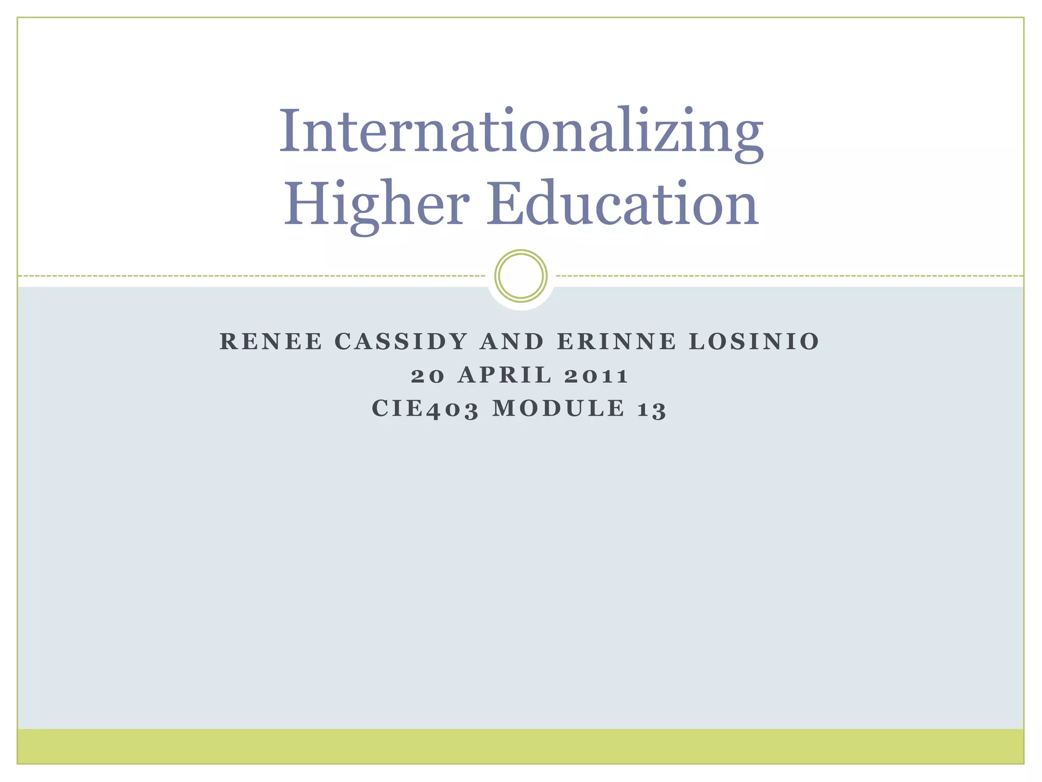 This document discusses the concepts of internationalization and globalization in higher education. It defines internationalization as integrating an international dimension into higher education institutions and their functions, while globalization refers to broader economic and social forces that internationalization aims to respond to. The document outlines debates around whether internationalization risks commodifying education and presents different views on universities' role in preparing students for a globalized world. It also explores trends in higher education like growing private institutions, rising student demand internationally, and challenges in balancing different stakeholder needs. The future is uncertain but may involve increased competition and new models of transnational education.