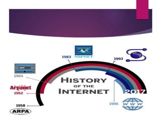 The document discusses the history and features of the internet. It provides a timeline of key developments from 2001 to 2016. Some of the earliest included the creation of Wikipedia in 2001 and LinkedIn in 2003. The internet allows for electronic mail, file transfers, online chat, and access to information through search engines and social media sites like Facebook and YouTube. While the internet provides knowledge and connects the world, it can also be a waste of time and enable the spread of negative information if not used carefully.