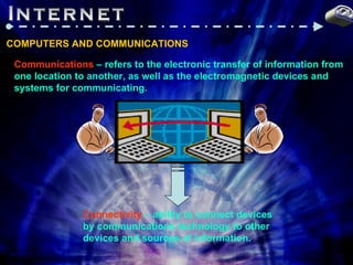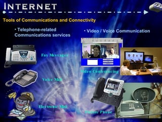The document discusses various tools and aspects of communications and connectivity, including telephone services, online information services, email, bulletin boards, the internet, portable work, telecommuting, and mobile workplaces. It provides an overview of the internet, including its history and development, structure as a network of networks using TCP/IP, common internet servers and services like email, web, and chat, and ways to connect to the internet through schools, workplaces, online providers or other methods.