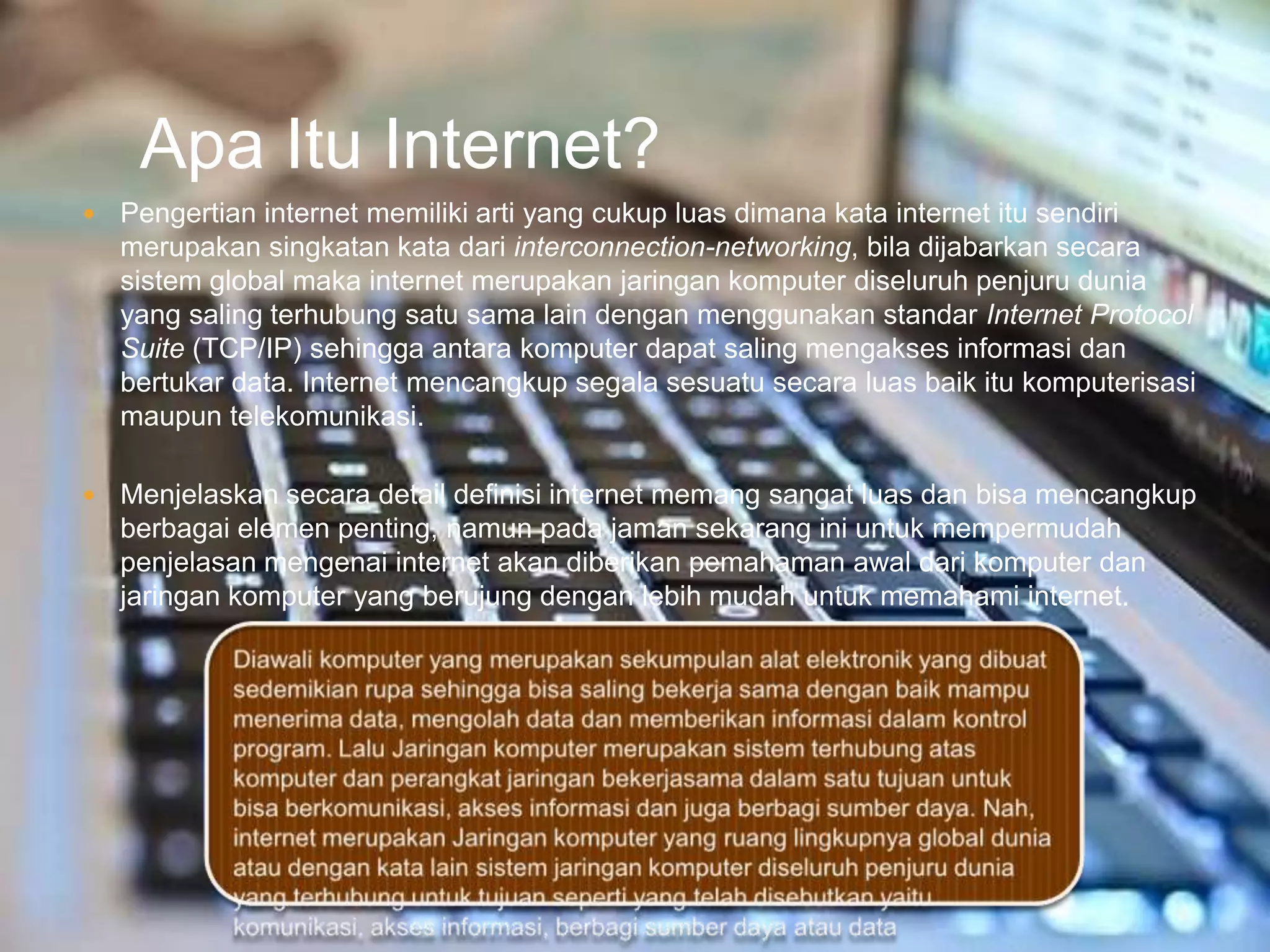 Menjelaskan secara detail definisi internet memang sangat luas dan bisa mencangkup