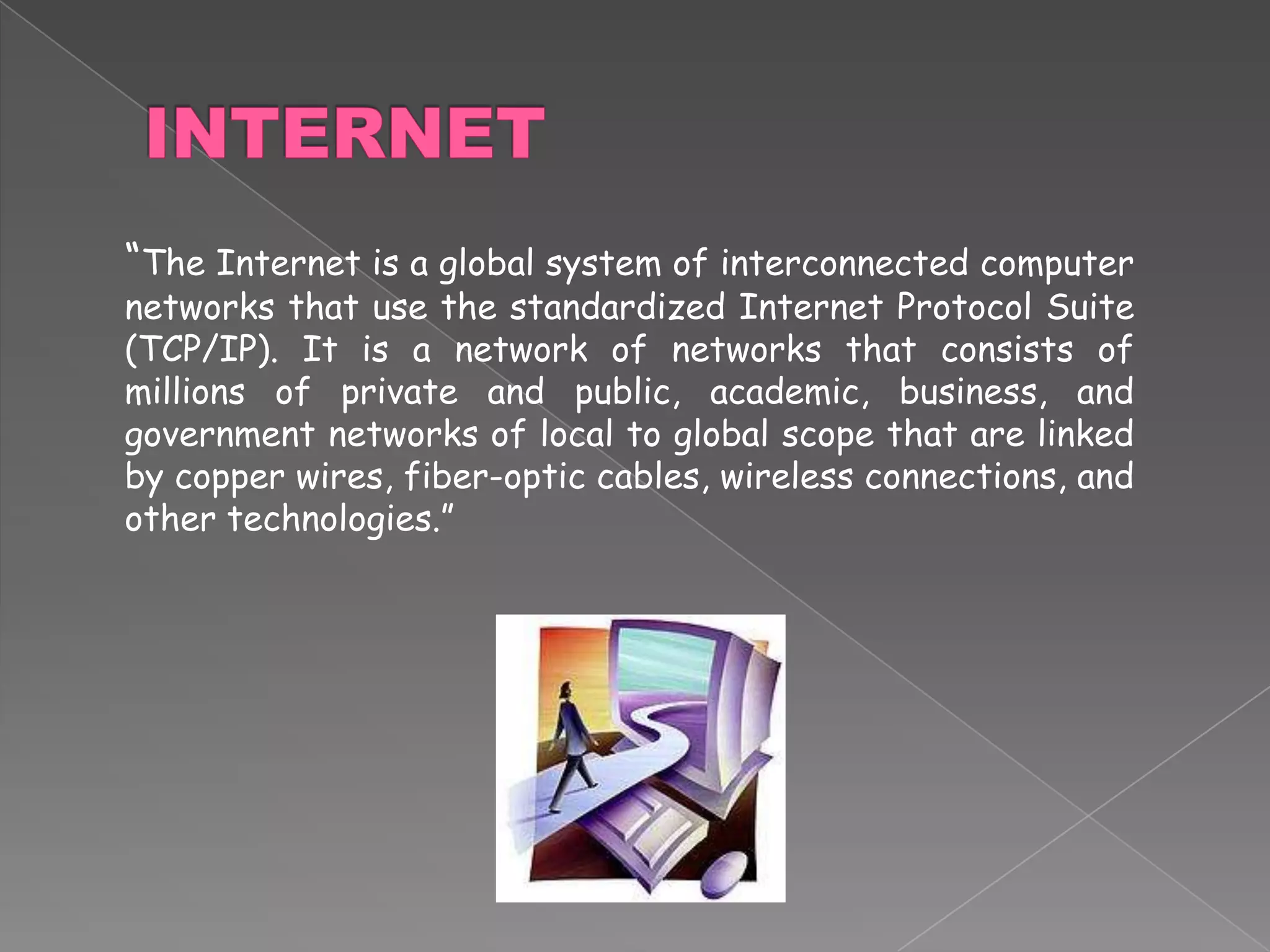 The document discusses the history and key aspects of the Internet. It provides definitions of the Internet as a global system of interconnected computer networks using standardized protocols. It describes how early research networks evolved into widespread internetworking. The summary also outlines some main advantages like email, information access, online services, and e-commerce. Disadvantages covered are theft of personal information, spamming, viruses, and pornography. Internet service providers are defined as companies providing access via technologies like dial-up, DSL, cable or wireless. The importance of the Internet in society is discussed with statistics on global Internet and computer usage.