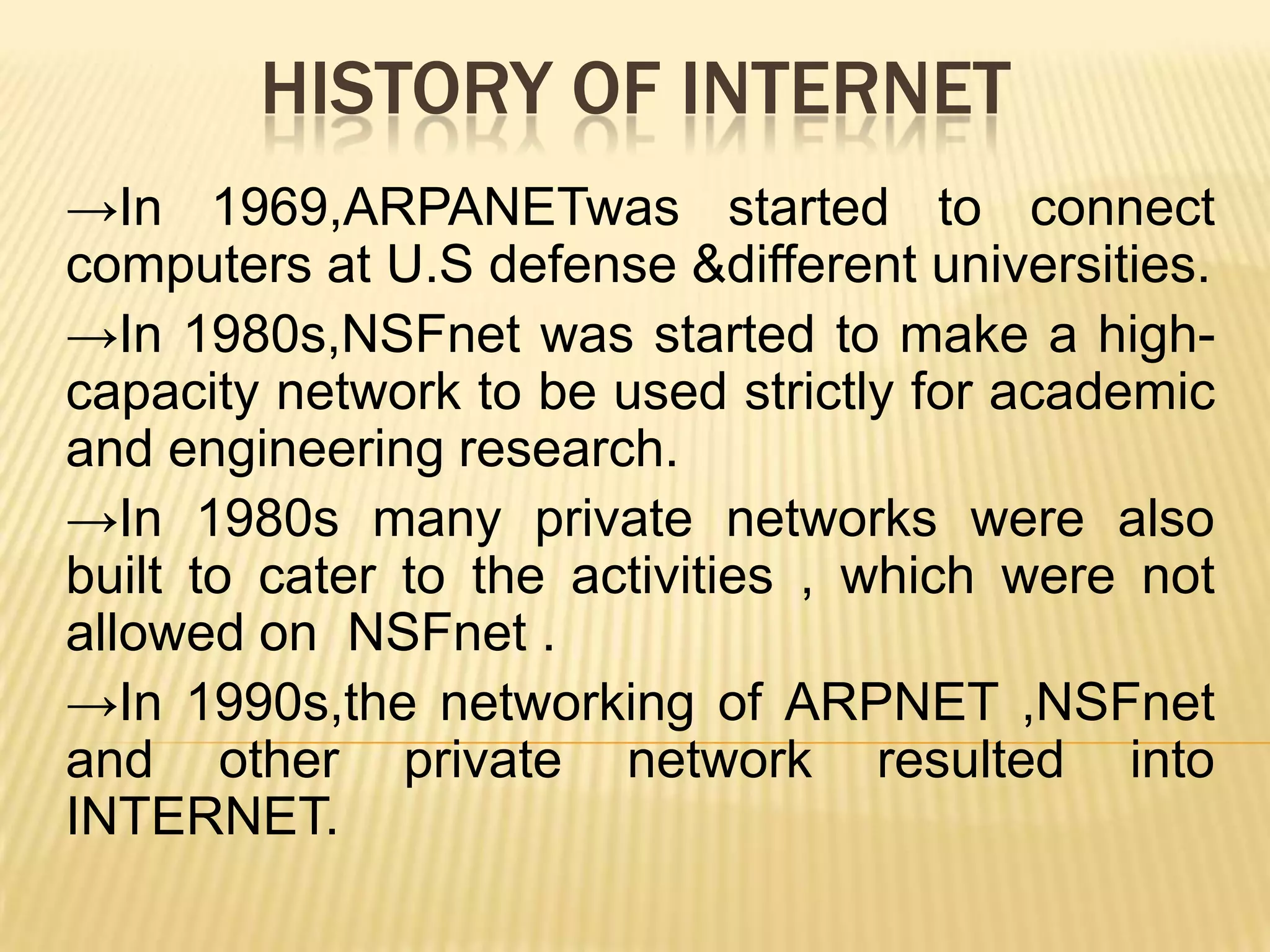 - The Internet began in 1969 as ARPANET to connect computers at universities and the defense department. NSFNET further expanded connectivity in the 1980s mainly for research.