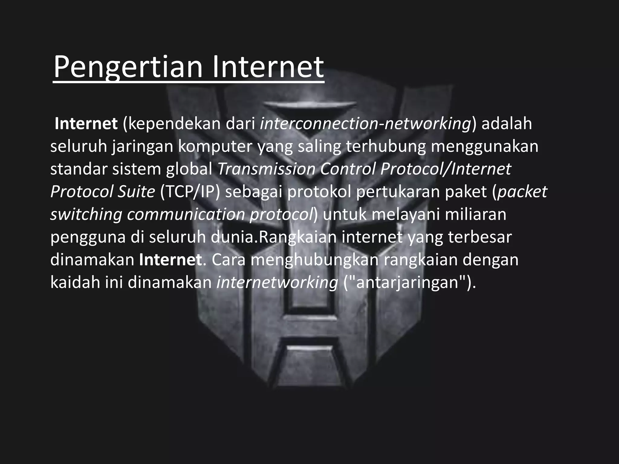 1. Internet adalah jaringan komputer global yang saling terhubung menggunakan protokol TCP/IP. 2. Internet awalnya dibangun oleh Departemen Pertahanan AS untuk keperluan militer dan komunikasi jarak jauh, kemudian berkembang menjadi jaringan sipil global. 3. Internet memungkinkan penyebaran informasi, komunikasi, dan transaksi secara online di seluruh dunia.