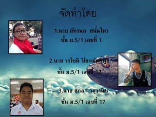 สนั่นไหว ชั้น ม.5/1 เลข ี่ 1 2.นาย วรโชติ ริ ยะณัตดิ์พูล ชั้น ม.5/1 เลข ี่ 12 3.นาย สกล วสุวานิช ชั้น ม.5/1 เลข ี่ 17
