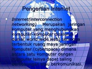 Dokumen tersebut menjelaskan pengertian Internet dan bagaimana cara kerjanya menghubungkan komputer di seluruh dunia, serta manfaat yang dapat diraih dari Internet seperti mendapatkan informasi, melakukan promosi bisnis, dan berkomunikasi secara online. Dokumen tersebut juga menjelaskan istilah-istilah yang digunakan dalam Internet beserta fasilitas dan perangkat keras yang dibutuhkan untuk mengakses Internet seperti komputer, modem