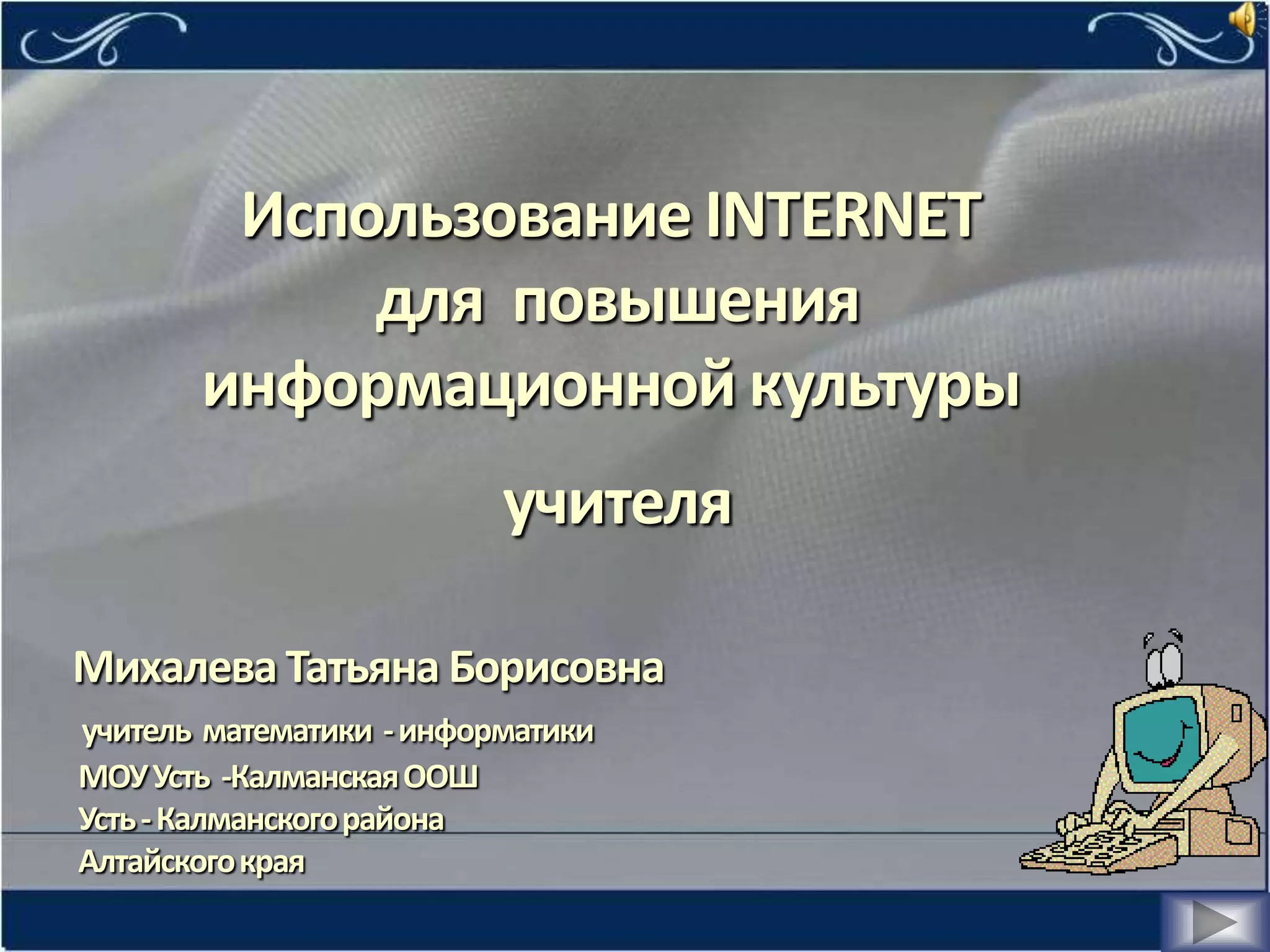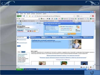 Документ описывает использование интернета для повышения информационной культуры учителей, включая участие в сетевых конференциях и форумах. Приводится информация о проектах и опыте применения информационно-коммуникационных технологий в образовательном процессе. Также документ содержит ссылки на собственные веб-страницы и курсы повышения квалификации, связанные с ICT.