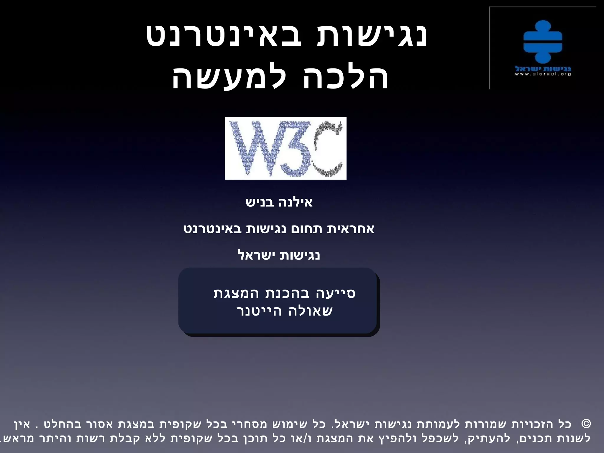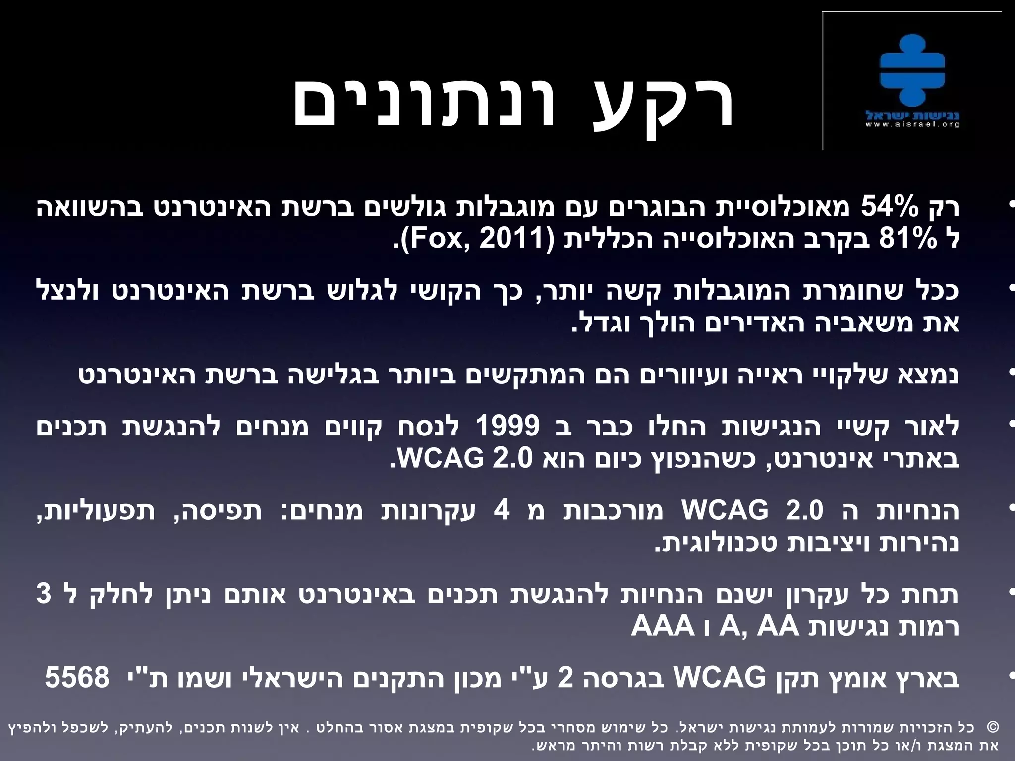 המצגת עוסקת בנגישות לאינטרנט ע"פ התקן הישראלי להצגת תכנים נגישים באתרי אינטרנט המבוסס על הנחיות ה Wcag 2.0 של משרד ה W3C הבינלאומי. מציגה את עיקרי התקן, דוגמאות לבעיות נגישות באתרי אינטרנט וטיפים להנגשת אתרים.