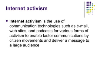 Internet activism uses communication technologies like websites and email to organize people around issues like human rights and the environment in order to create social change. Hacktivism combines hacking and activism by using techniques like website defacements and denial of service attacks to disrupt services and draw attention to political or social causes in a nonviolent way. While activism and hacktivism can be effective in achieving goals, they also face criticisms like furthering divisions in society and potentially disrupting free speech.