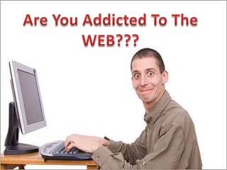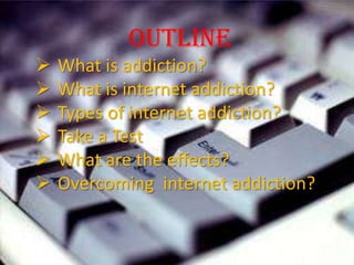 The document discusses internet addiction, including its types, symptoms, effects, and ways to overcome it. It defines internet addiction as problematic internet use including activities like social media, online gaming, and general surfing. Some signs include feeling nervous or depressed when reducing use and using the internet to escape problems. Effects can include physical issues, depression, sleep disorders, and negative social impacts. Suggested ways to overcome addiction include limiting daily internet time and finding substitute offline activities.