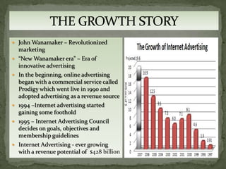 The document discusses various types of online advertising including display ads, classified listings, rich media ads, click-through advertising, and conversion optimization. It provides details on the history and evolution of online advertising. Key points covered include advantages and drawbacks of different ad formats, metrics like click-through rates, and methods to increase conversion rates.