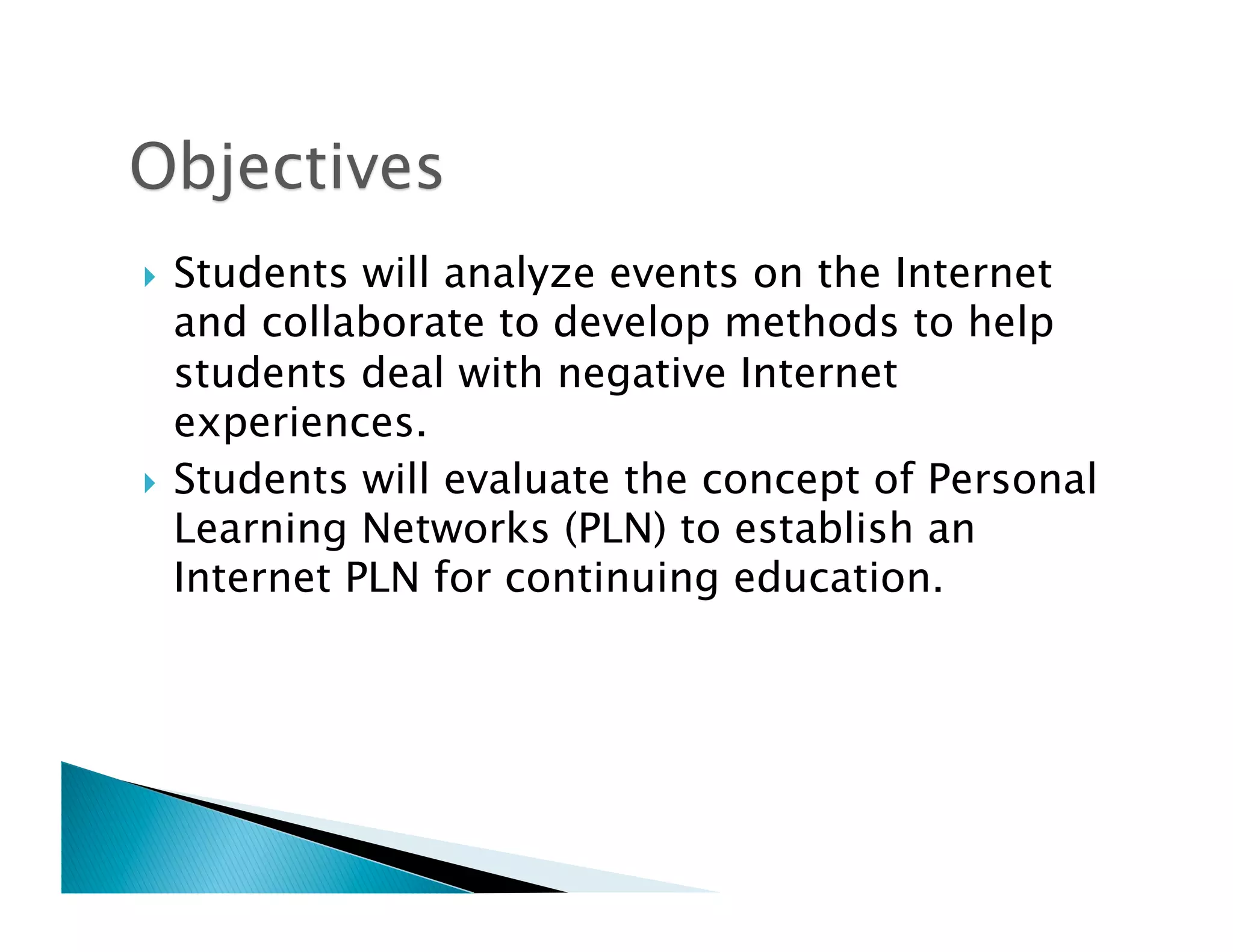 The document discusses negative internet experiences and cyberbullying among students. It defines cyberbullying and notes research showing its negative impacts on students' well-being. Students will analyze cyberbullying events and methods to help students dealing with such experiences. They will also evaluate Personal Learning Networks to establish an internet PLN for continuing education, listing various social media and collaboration platforms that can be used.