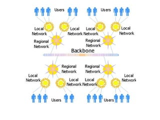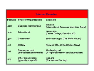 The Internet was created by ARPA and the U.S. Department of Defense and uses TCP/IP protocols to connect networks together globally. It provides services like the World Wide Web, email, file transfers, and more through interconnected networks that route data between hosts and clients. Application programs also integrate features that allow publishing content to and viewing content from the Internet.