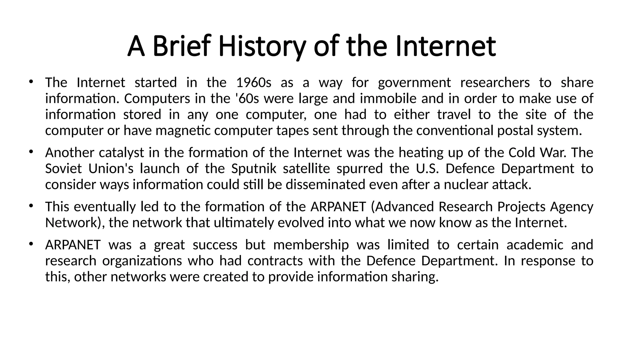 • The Internet started in the 1960s as a way for government researchers to share