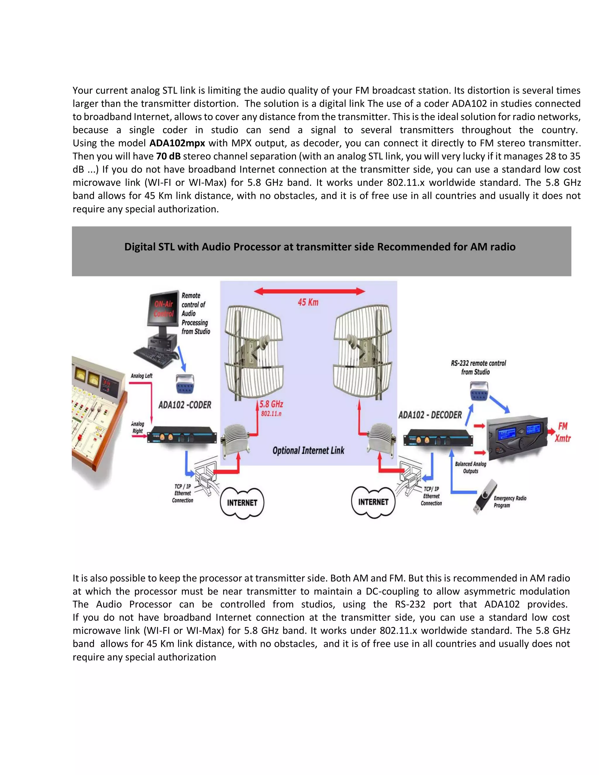 1) Using a digital audio coder like the ADA102 allows broadcasting high quality audio over long distances via the internet or microwave links.