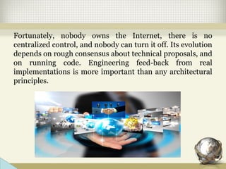 - The Internet is a network of networks that connects millions of devices globally using standardized communication protocols like TCP/IP. There is no single entity that controls it.