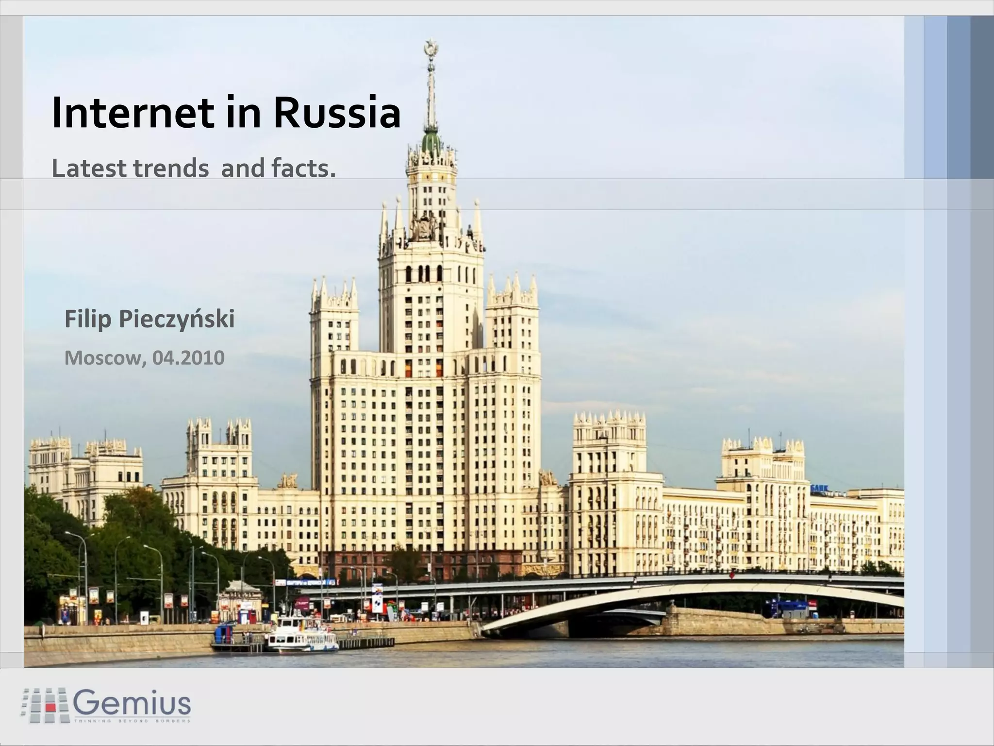 This document provides an analysis of internet usage trends in Russia based on data from the gemiusAudience study from February 2010. Some of the key findings include: