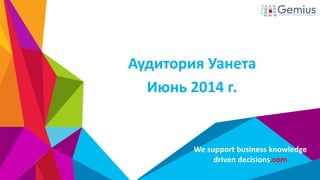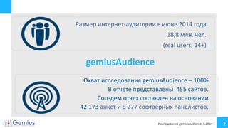 Документ представляет собой отчет о составе и характеристиках интернет-аудитории Украины в июне 2014 года, охватывая 18,8 миллионов пользователей старше 14 лет. В нем содержится информация о демографических данных, таких как пол, возраст, образование, семейный доход и занятия респондентов. Также представлена статистика посещаемости топовых сайтов и социальной активности пользователей в интернете.