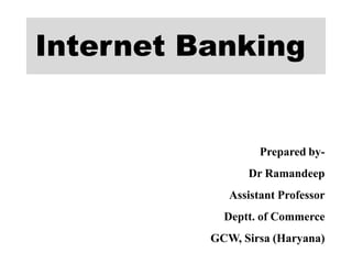 Internet banking allows customers to perform banking activities through the internet rather than visiting a branch in person. It offers convenience through anytime, anywhere access on a personal computer. Key features include fast and efficient transactions using digital processing. Banks benefit through reduced costs, increased customer base and risk reduction while customers benefit from prompt service, time savings and more convenience. Delivery channels for e-banking include CBS, ATMs, smart cards and online services like bill payment, shopping, trading and fund transfers. However, issues like security, infrastructure costs, user awareness and unauthorized access pose limitations. Common models are complete centralized solution and cluster approach.