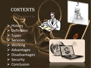 This document discusses internet banking. It begins with a brief history of internet banking starting in 1981 with four major New York City banks offering early home banking services. It then defines internet banking as conducting bank transactions online instead of in person. The document outlines the types of internet banking, services provided, how it works involving web servers and security, advantages like lower costs and convenience, disadvantages like security risks, and concludes that internet banking aims to provide valuable services to consumers by utilizing the internet.