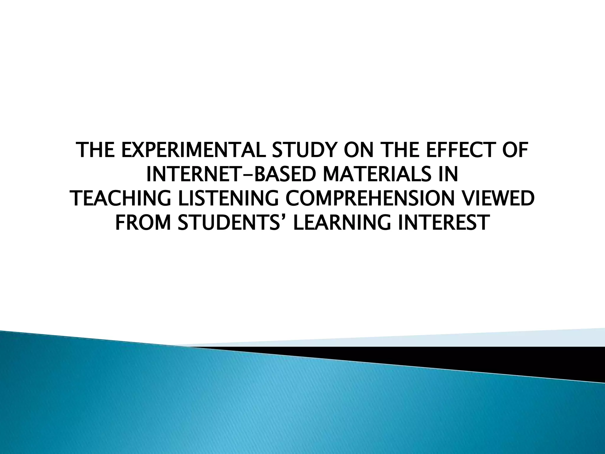 The document outlines an experimental study that examines the effect of internet-based materials versus textbook materials on teaching listening comprehension, considering students' learning interest. It presents background on factors like teaching materials, listening comprehension, and learning interest. The study aims to determine if internet-based materials are more effective than textbooks, if students with high interest comprehend better, and if there is an interaction between materials and interest. It will use a 2x2 factorial design experiment involving pre- and post-tests with eleventh-grade students, collecting data through tests and questionnaires then analyzing it statistically.