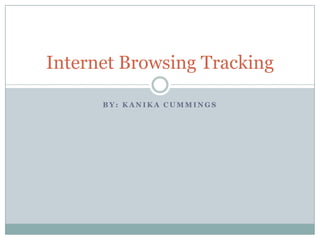 This document discusses internet browsing tracking and cookies. It explains that cookies are small pieces of data stored in a user's browser that allow websites to remember information about a user's previous visits. While this allows for personalized experiences and targeted advertising, it can also mean a lack of privacy and control over personal data. The document provides tips on increasing privacy such as using private browsing modes and websites that block tracking.