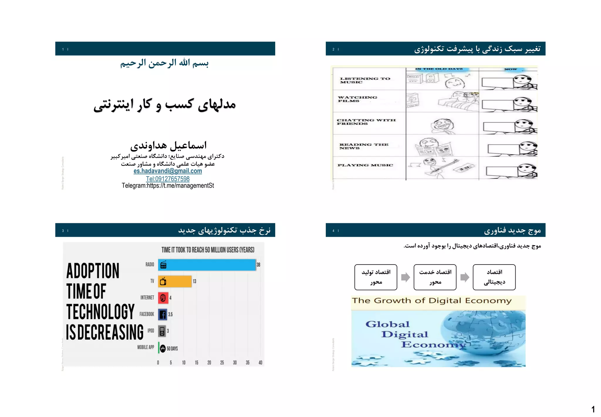 و کسب مدلهای هداوندی اسماعیل امیرکب صنعتی دانشگاه صنایع؛ مهندسی دکتراییر صنعت مشاور و دانشگاه علمی هیات عضو es.hadavandi@gmail.com Tel:09127657598 Telegram:https://t.me/managementSt الرحیم الرحمن اهلل بسم RolandBergerStrategyConsultants 2 I تکنولوژی پیشرفت با زندگی سبک تغییر RolandBergerStrategyConsultants 3 I جدید تکنولوژیهای جذب نرخ RolandBergerStrategyConsultants 4 I فناوری جدید موج است آورده بوجود را دیجیتال فناوری،اقتصادهای جدید موج. تولید اقتصاد محور خدمت اقتصاد محور اقتصاد دیجیتالی
