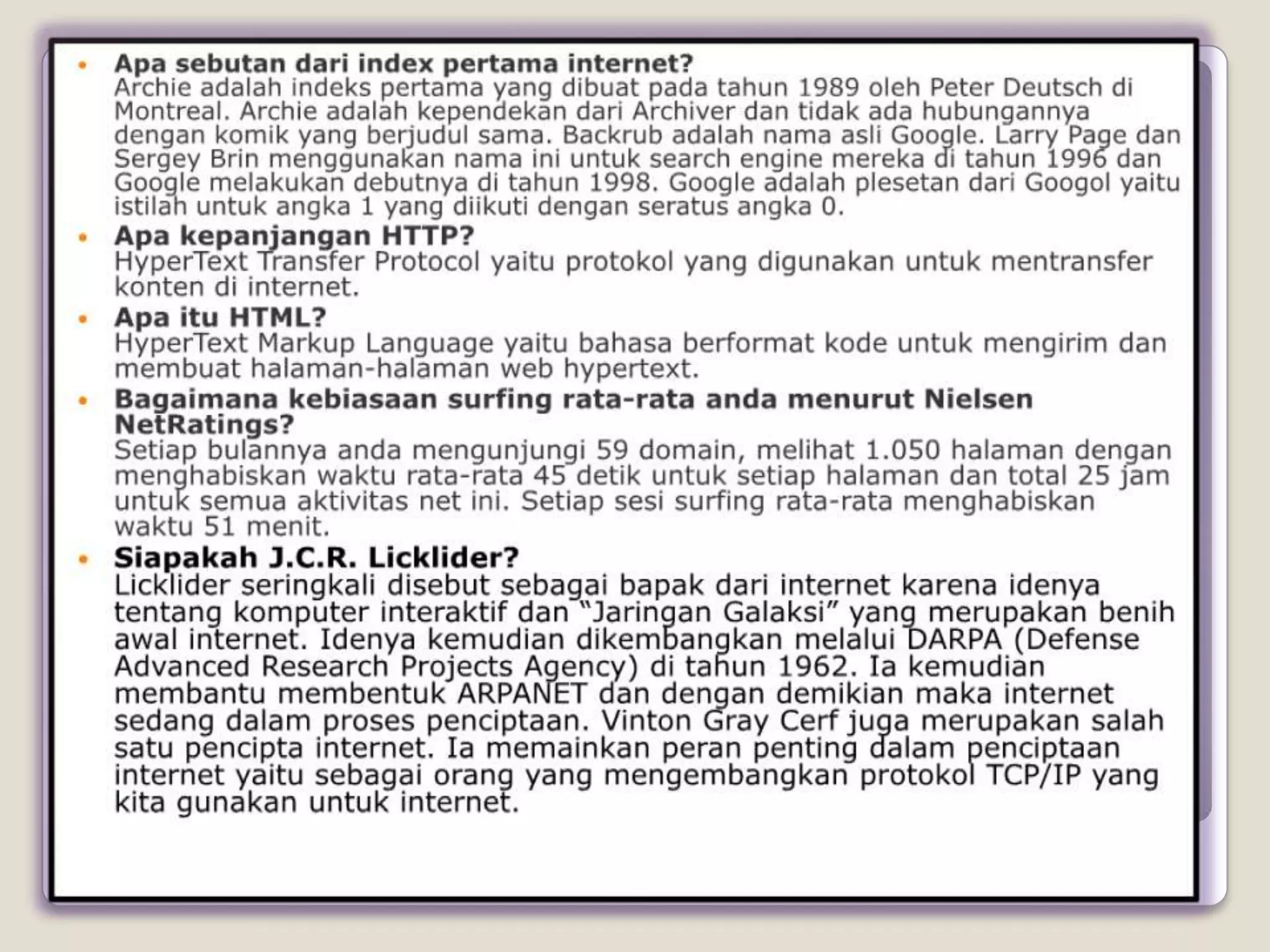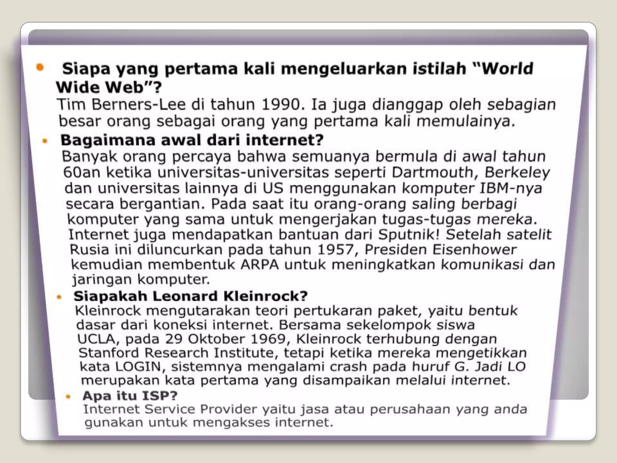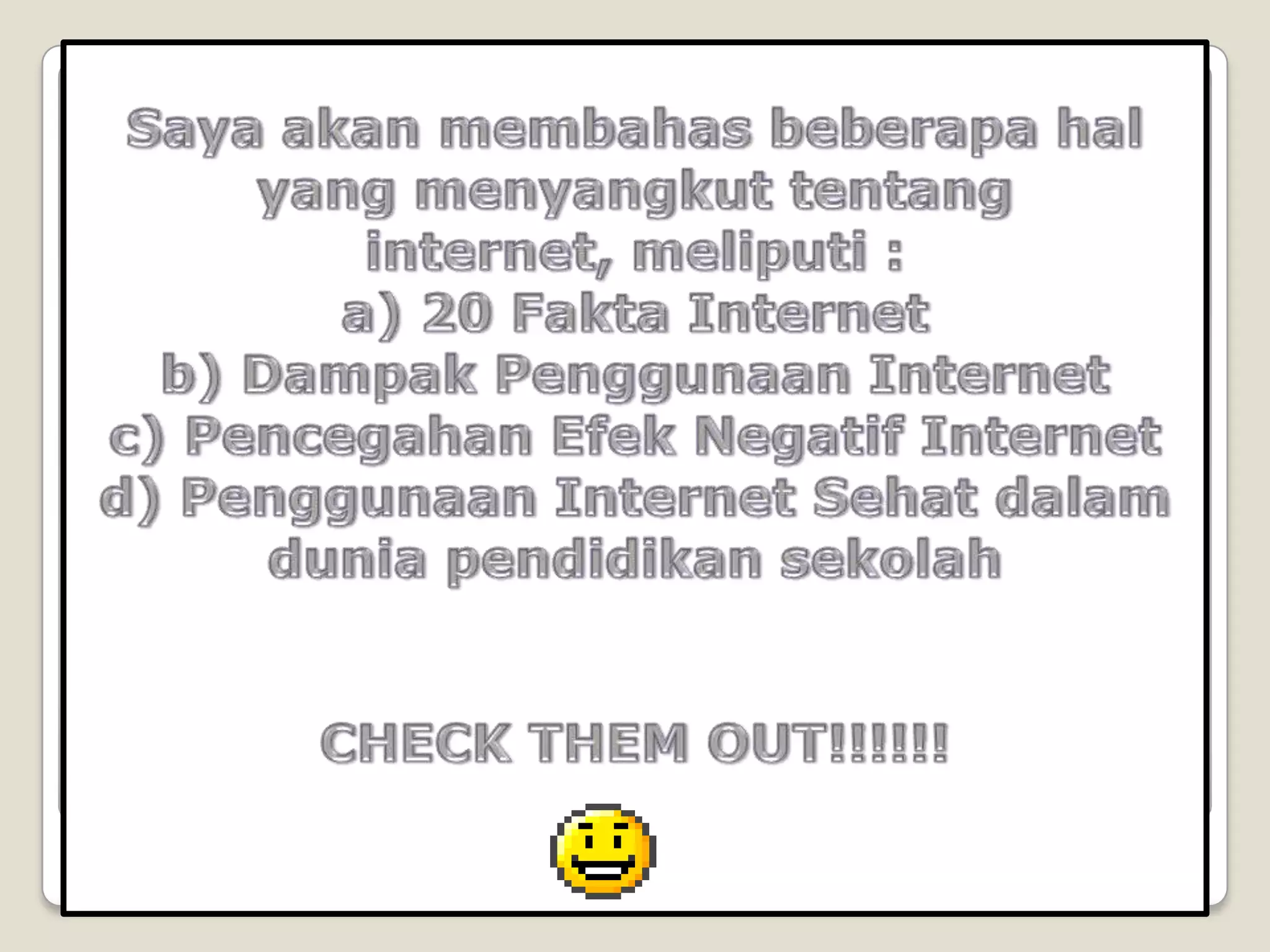 Dokumen tersebut memberikan informasi mengenai internet, termasuk sejarah, dampak positif dan negatif penggunaan internet, serta langkah-langkah untuk menggunakan internet secara sehat. Dokumen tersebut juga membahas peran sekolah dalam membimbing siswa agar menjadi pengguna internet yang bertanggung jawab.