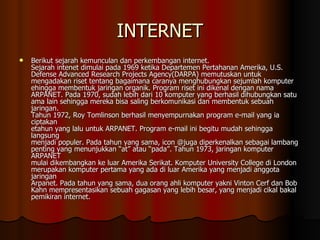 Dokumen ini menjelaskan sejarah dan perkembangan internet serta intranet dari tahun 1969 hingga saat ini, termasuk penemuan penting seperti email dan World Wide Web. Internet menyediakan berbagai informasi dan komunikasi tanpa batas, sementara intranet berfungsi sebagai jaringan privat untuk perusahaan. Dokumen juga membahas manfaat dan komponen penting dalam membangun dan menggunakan intranet dalam konteks pendidikan dan bisnis.
